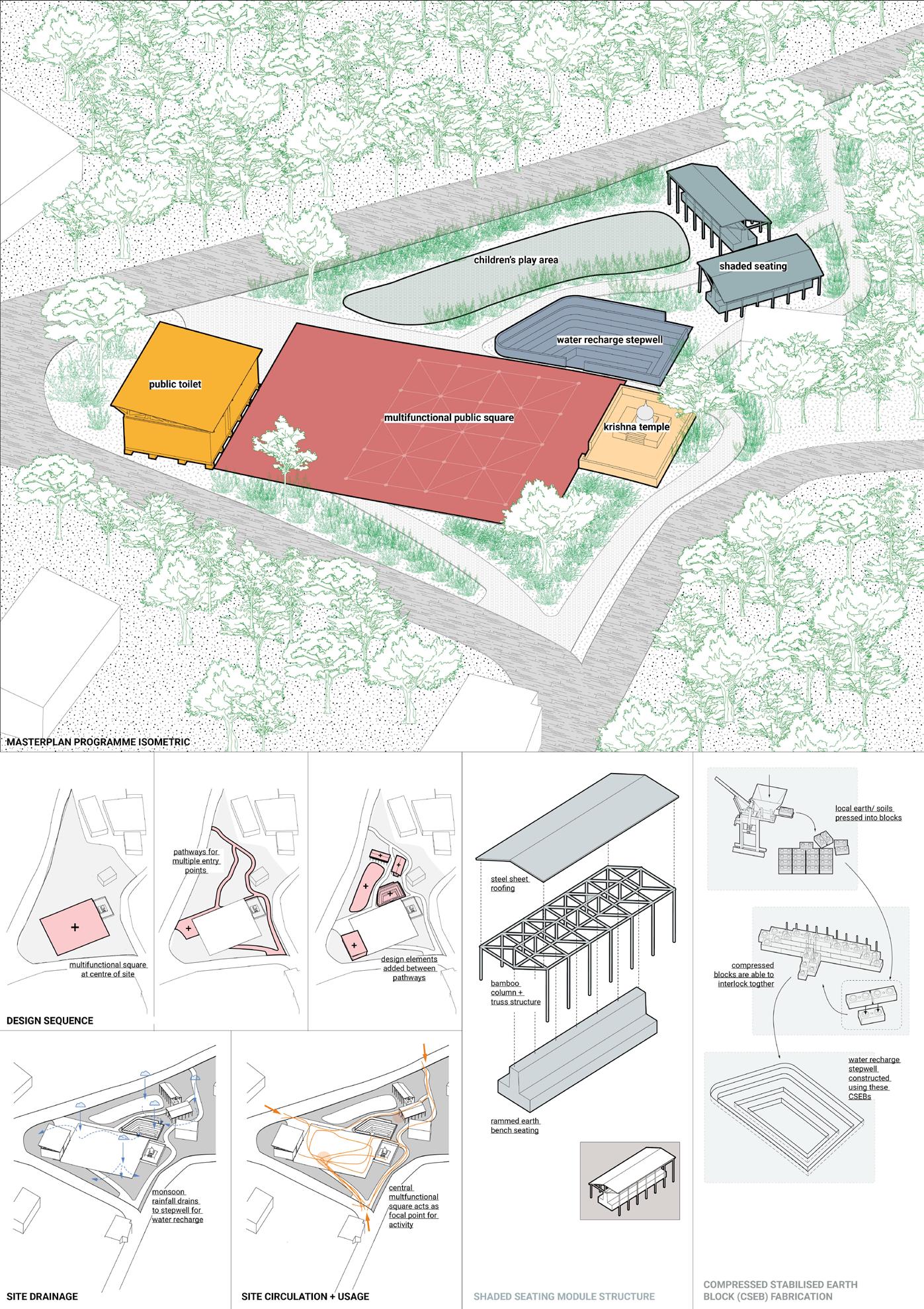 In Chandragiri, a central square anchors the design, bordered by a restored Krishna temple, accessible public toilets and an earthen stepwell with integrated seating. The upper park includes a play area and shaded rest spaces, linked by gentle paths. All three sites prioritise safety, accessibility, tree retention and passive water management. Materials are sourced locally, reducing carbon impact and supporting community construction skills. Together, these parks offer a scalable approach to public space design that strengthens social connection, improves urban resilience and supports the wellbeing of growing peri-urban populations in Nepal.