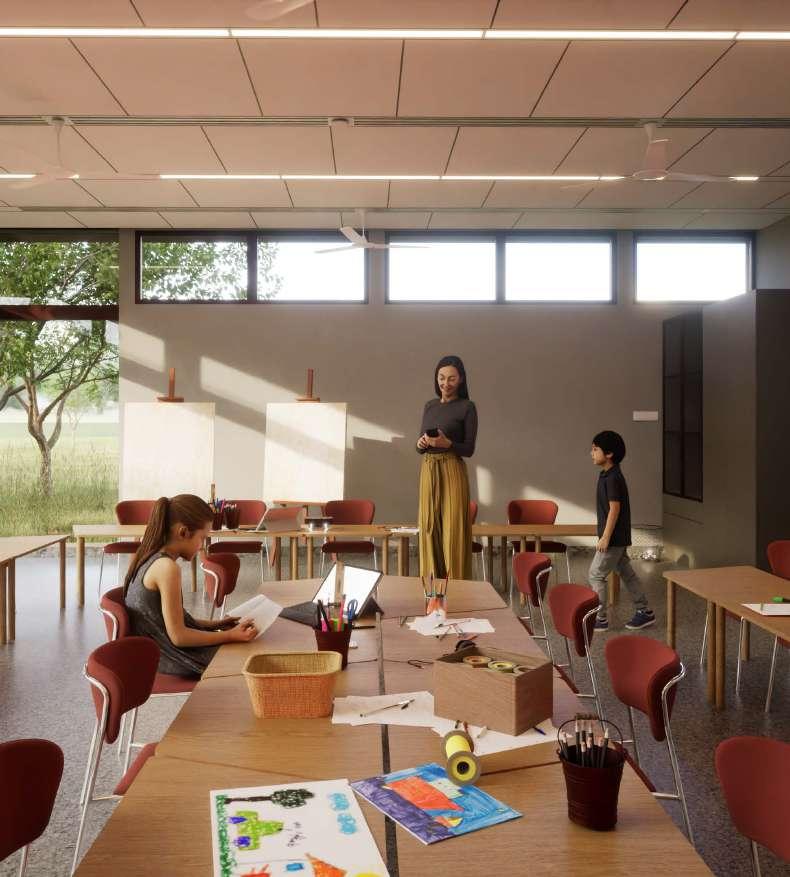 This wall section detail shows the fixing details of the windows to the wall as well as the canopy of the parasol above the classrooms.