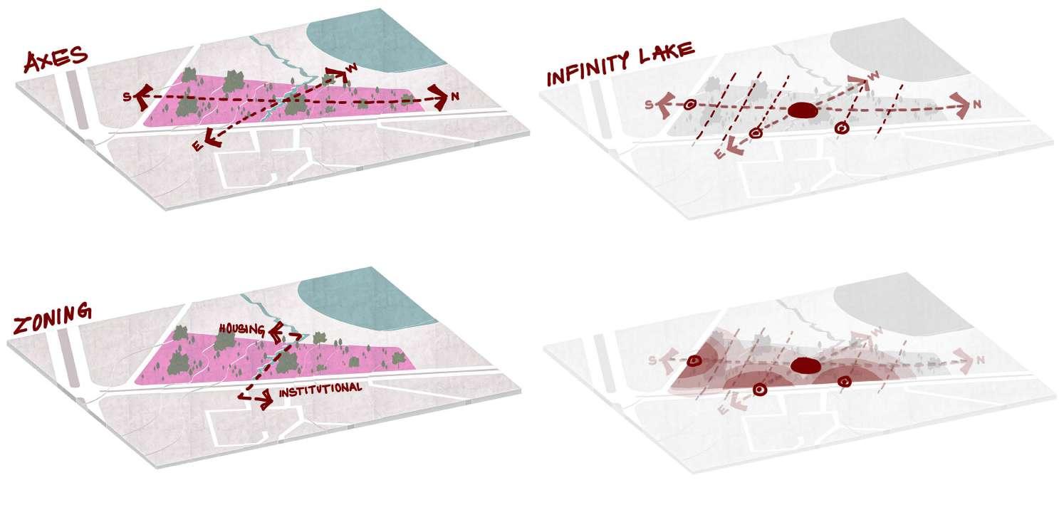 Concept diagrams show functional zoning into distinct districts.