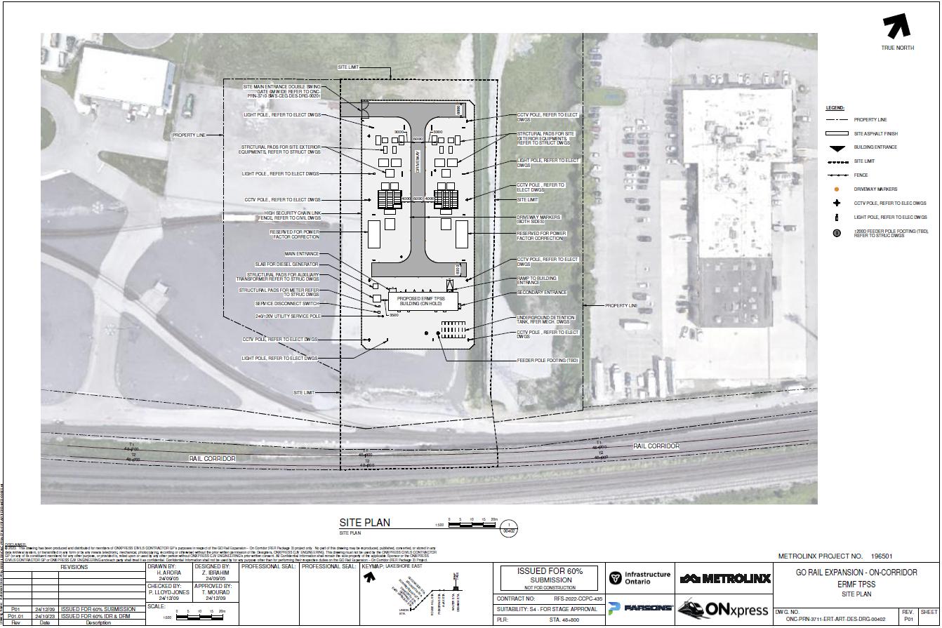 Site Plan submission coordinated with utility, civil, structure and electrical and CPTED teams, showing access roads, railway tracks, utility equipment, structural pads for the same and electrical and camera poles.