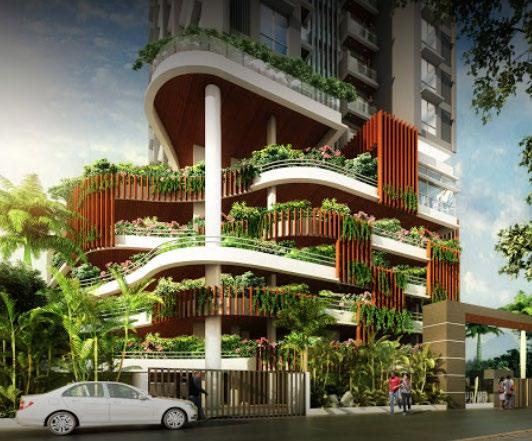 A mid scale, high rise architectural project with poetic curves, wooden fins and green walls as captivating design elements