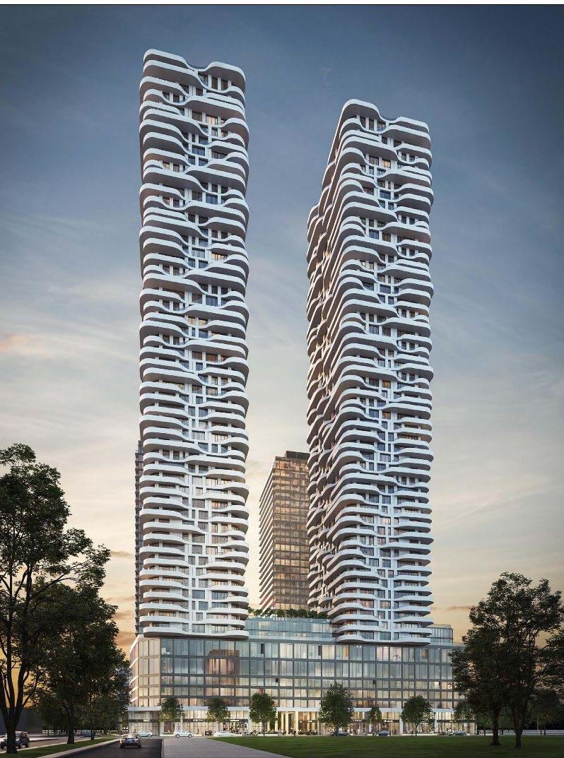 View of 180 steels Avenue west-These towers are wrapped with architecturally distinctive curvilinear balconies. Its outstanding façade won gold in the Architecture Technology Concept category of the UDAD Awards in 2022.