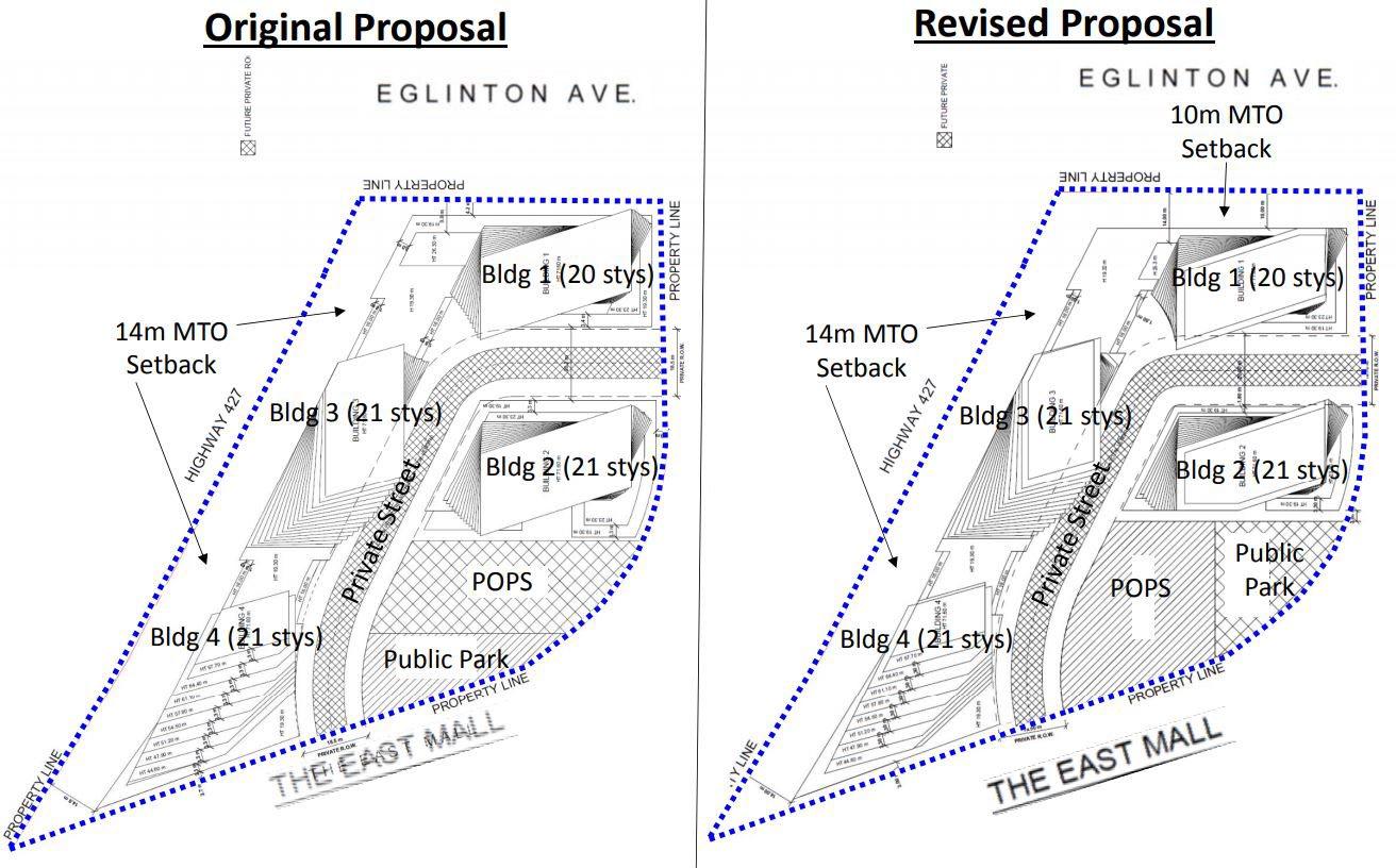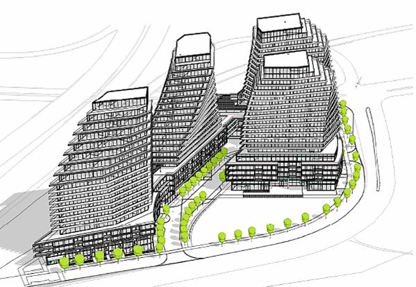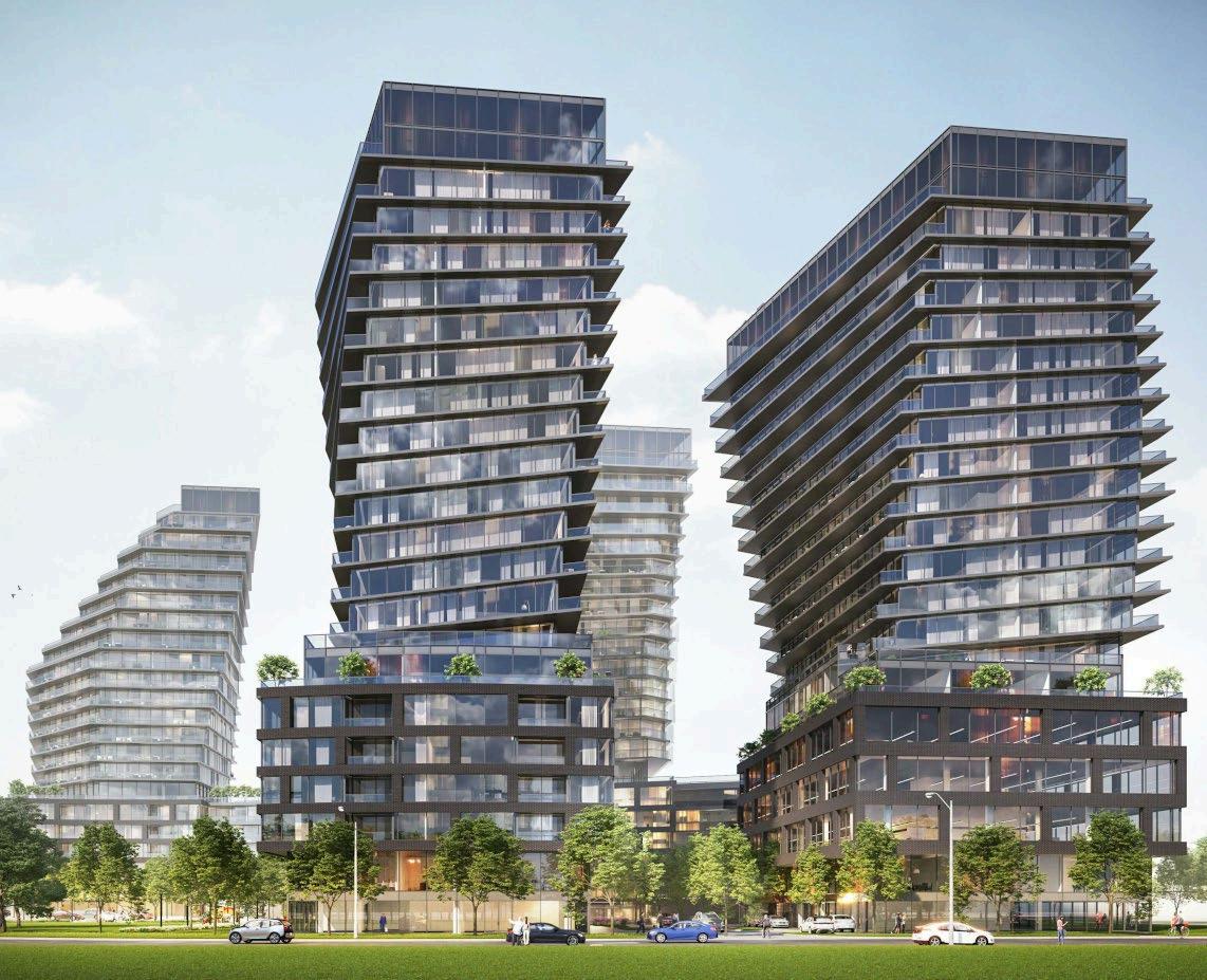 900 The East Mall: proposed four buildings with 20 and 21-storey mixeduse condominium buildings, designed for Harhay Developments.. The residential towers feature a series of twisting floor plates to give a spectacular elevation.