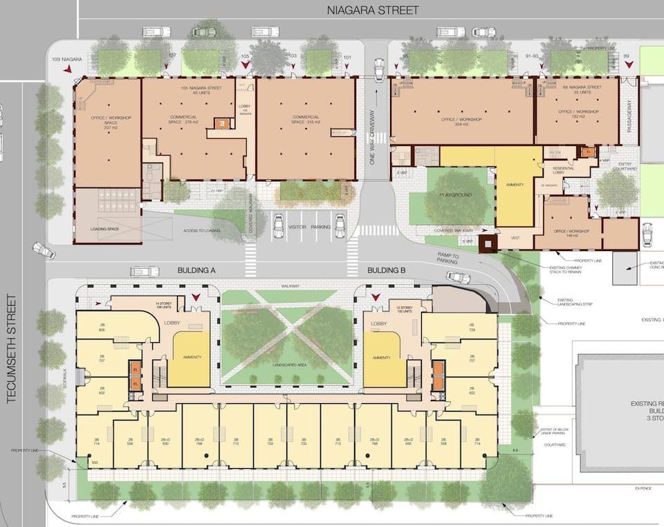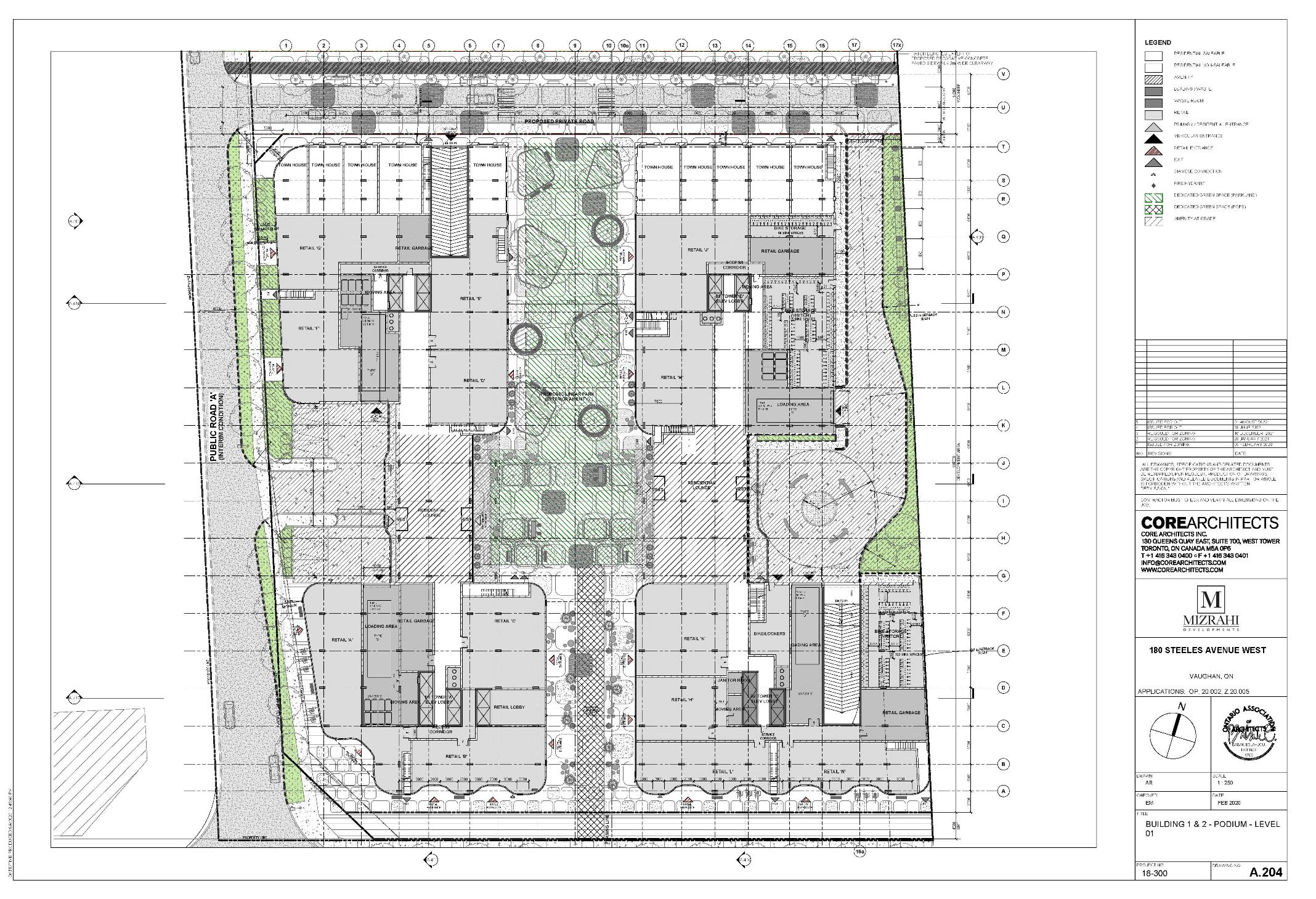 The condominium towers-4 towers being 35 and 45 storeys are designed with retail at lower levels and residential on upper floors. Two towers at the back furthest from the main street are 16 storeys with grade-related townhouses providing a transition to the adjacent residential neighborhood. The total of 2,080 residential units to this area of Steeles Avenue West is a mix of studios, three-bedroom units and townhouses.