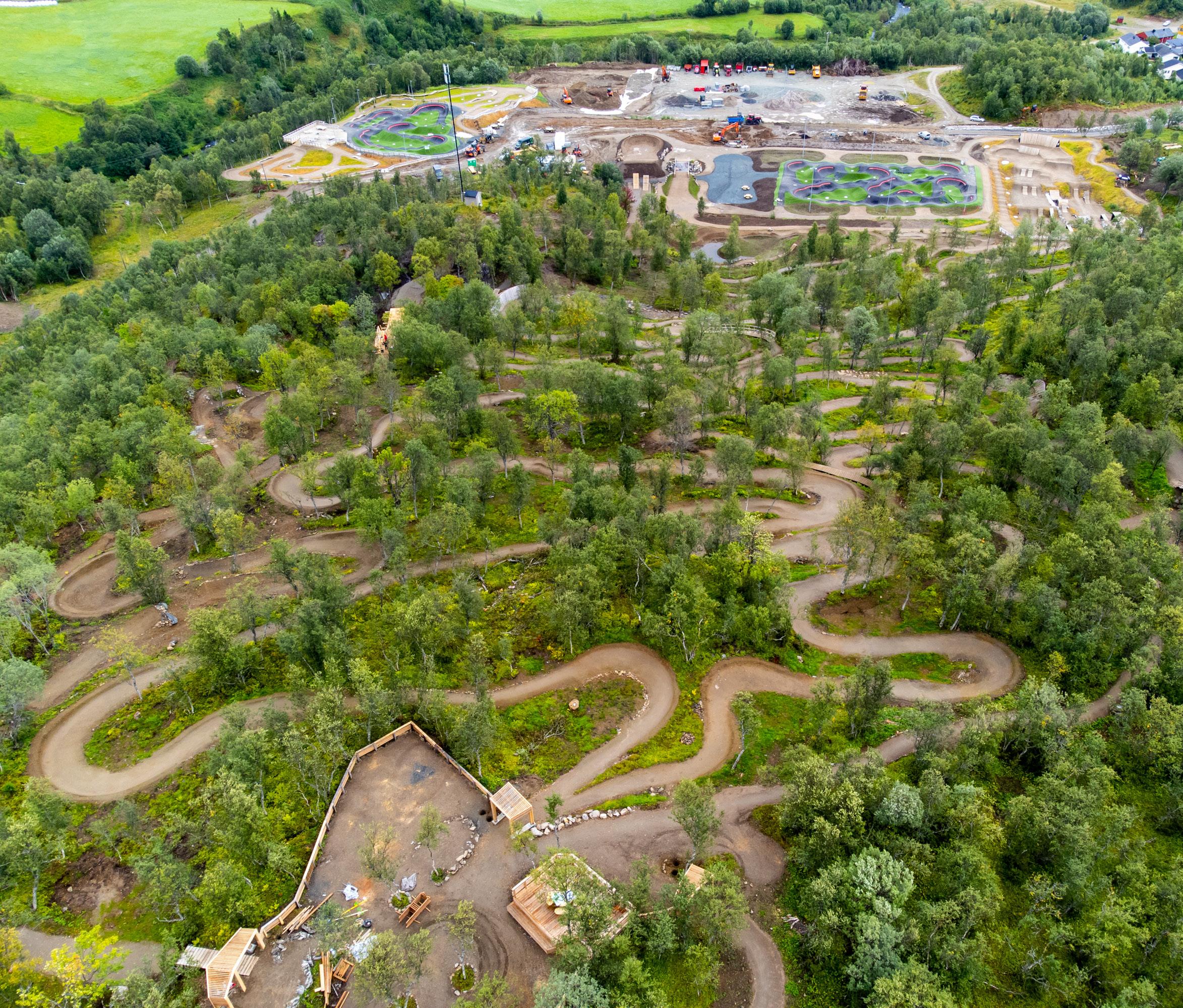 LØYPE: Sykkelstier slynger seg ned fra toppen og mot pumptracken nederst i bakken.