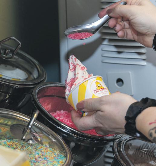 Av strøssel kan du velge blant klassikerne sjokolade, daim, krokan, oreo, søt eller sur jordbær – pluss litt til! Karamell og sjokoladesaus smaker også godt.