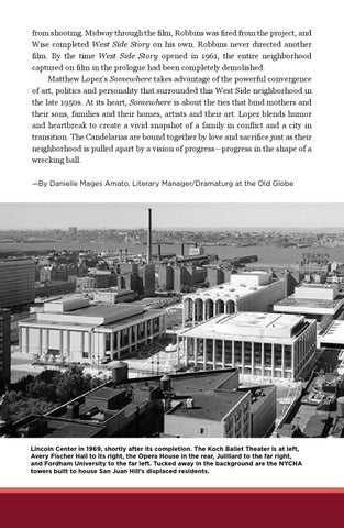 from shooting. Midway through the film, Robbins was fired from the project, and Wise completed West Side Story on his own. Robbins never directed another film. By the time West Side Story opened in 1961, the entire neighborhood captured on film in the prologue had been completely demolished. Matthew Lopez’s Somewhere takes advantage of the powerful convergence of art, politics and personality that surrounded this West Side neighborhood in the late 1950s. At its heart, Somewhere is about the ties that bind mothers and their sons, families and their homes, artists and their art. Lopez blends humor and heartbreak to create a vivid snapshot of a family in conflict and a city in transition. The Candelarias are bound together by love and sacrifice just as their neighborhood is pulled apart by a vision of progress—progress in the shape of a wrecking ball. —By Danielle Mages Amato, Literary Manager/Dramaturg at the Old Globe