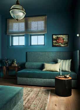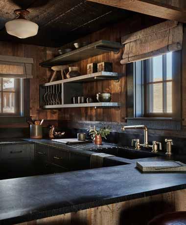 The Cowboy Cabin’s reclaimed wood walls and salvaged hardwood floors honor its history. Textured new pieces blend seamlessly with unique vintage finds, including a reupholstered French loveseat (c. 1880) at the foot of the bed, covered in Holland & Sherry houndstooth, and 19thcentury industrial cranks repurposed as barstools with leather seats.