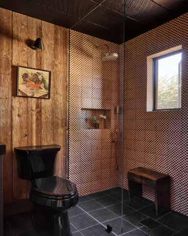 BELOW LEFT The bathroom features custom red clay checkered wall tiles, complemented by Ann Sacks’ Noir Sully limestone flooring.