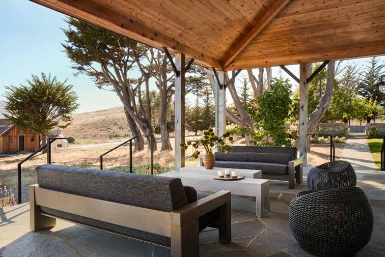 TOP A shaded seating area provides refuge from the sun. Naturally weathered cedar boards line the eaves, while rough-sawn cedar beams with steel accents complement the architecture. Swivel chairs from Palecek offer flexible views from all angles.