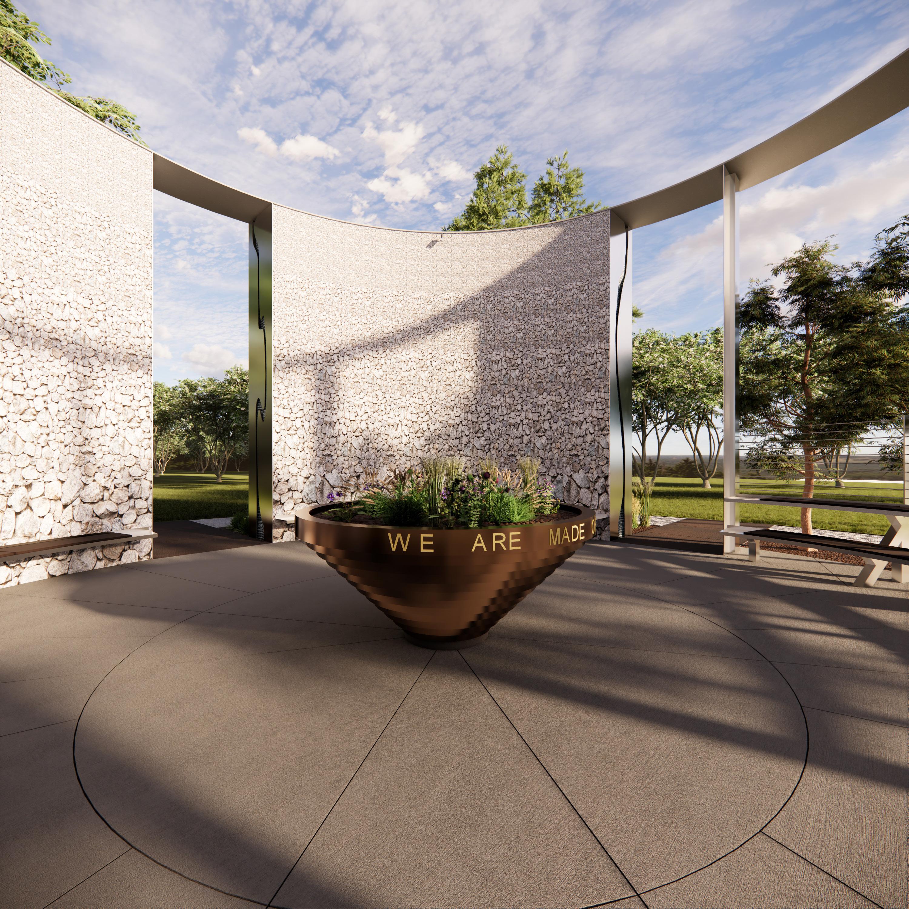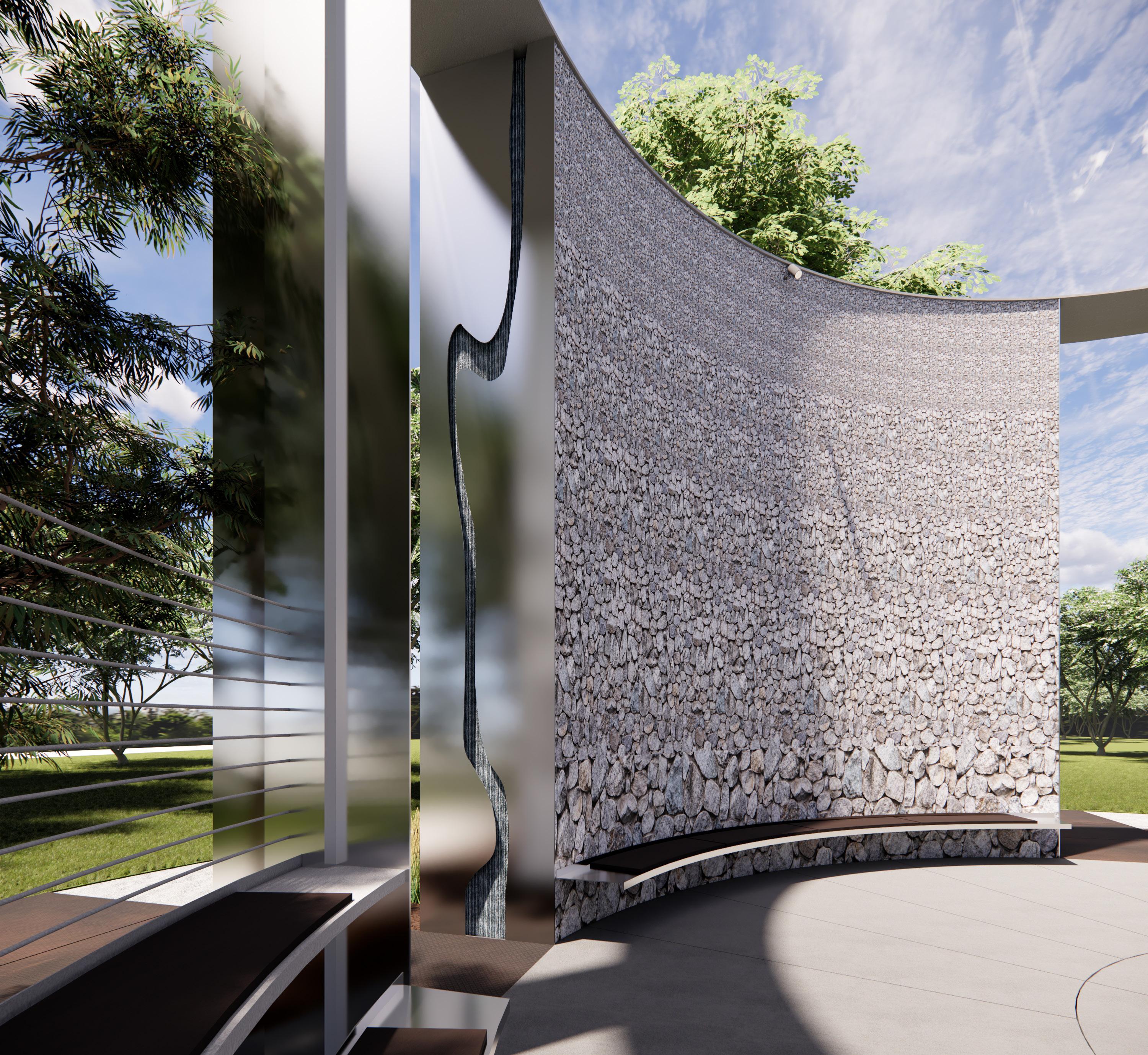 Water Curia will be located along Fleur Drive between Gray’s Lake and the Lauridsen Amphitheater, nestled among the trees of Water Works Park. Large natural stones will anchor the sculpture, gradually transitioning to smaller stones that illustrate how water is filtered through the park’s underground gallery system. At night, a soft halo of LED lighting will illuminate the pavilion, casting warm, welcoming shadows that invite motorists, cyclists, and pedestrians into this symbolic gateway to the city.