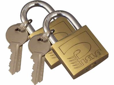 Messinkisen riippulukon sanka on karkaistua terästä, lukkopesä messinkiä ja mukana tulee kaksi avainta./ Hänglåsets bygel är i mässing och härdat stål, låskistan i mässing och två nycklar medföljer. (YG09)