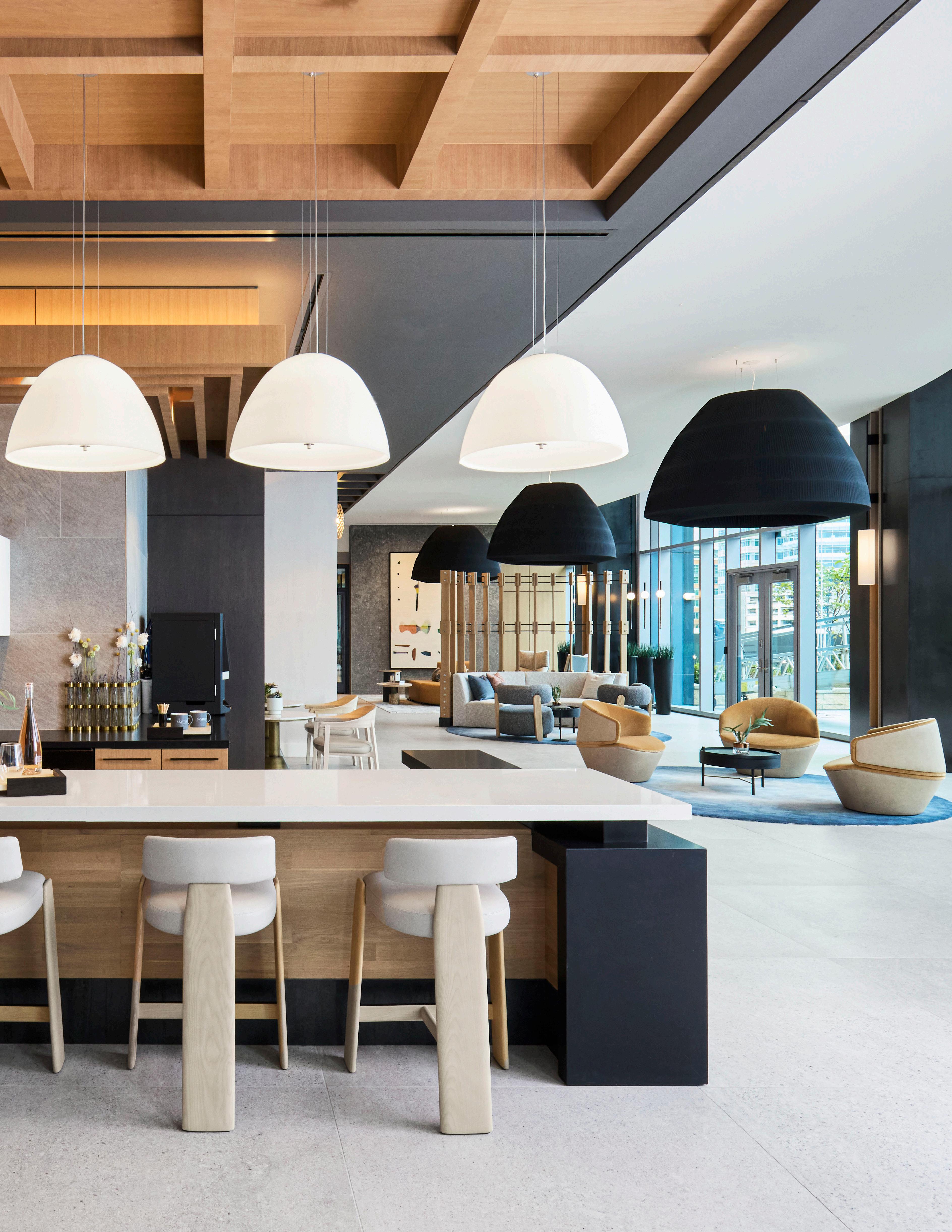 Style: Blends playful vintage charm with sleek contemporary style. A vibrant color palette, anchored by black, white, and warm wood tones, is brought to life with standout touches like lockable subway doors. Full-height glass, soaring ceilings, and views of the courtyard create a bright, airy space that connects effortlessly to both the city and nature.