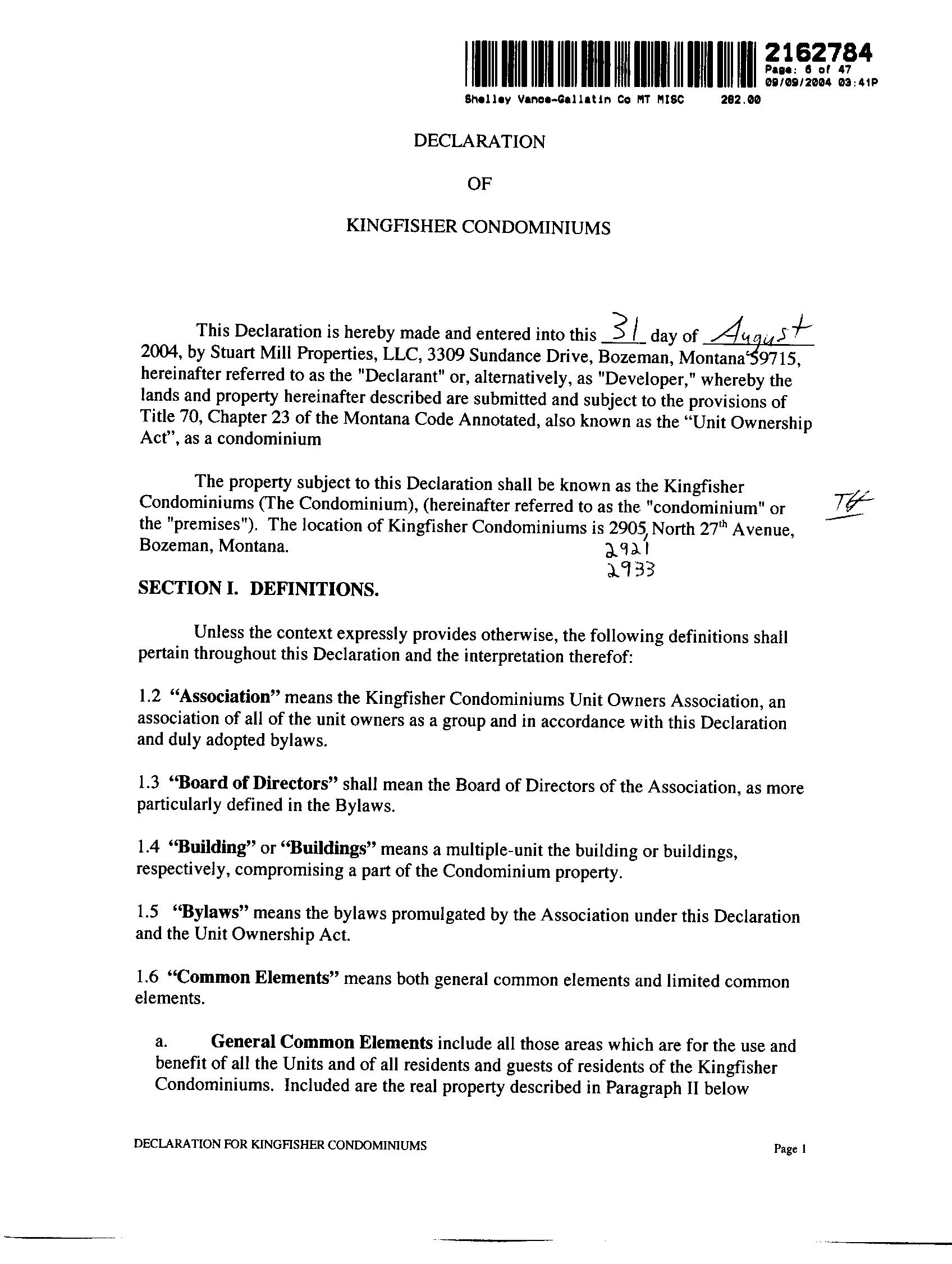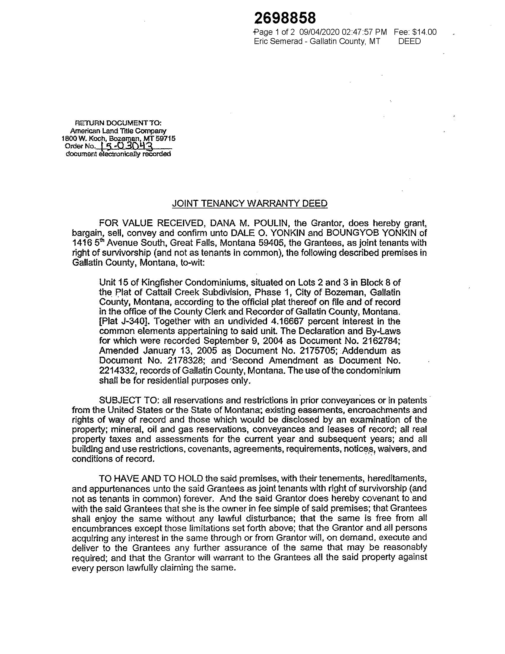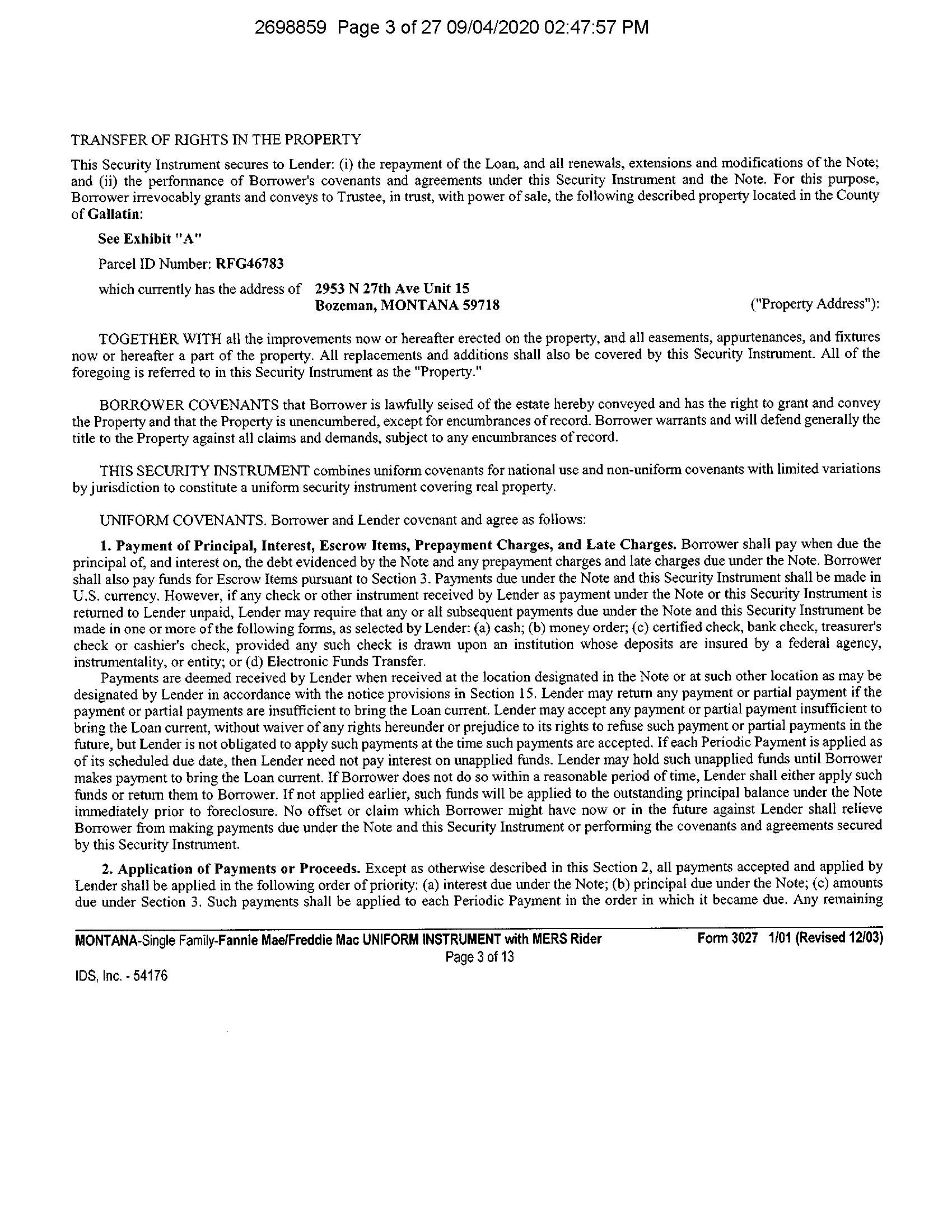 Legal Records: Geo Code: 06-0904-35-2-03-03-7015 Instru#: 2698858 Date: 2020-09-04 Property address: 2953 N 27TH AVE UNIT 15, BOZEMAN MT TRS: T01 S, R05 E, Sec. 35 Legal: KINGFISHER CONDO, S35, T01 S, R05 E, UNIT 15