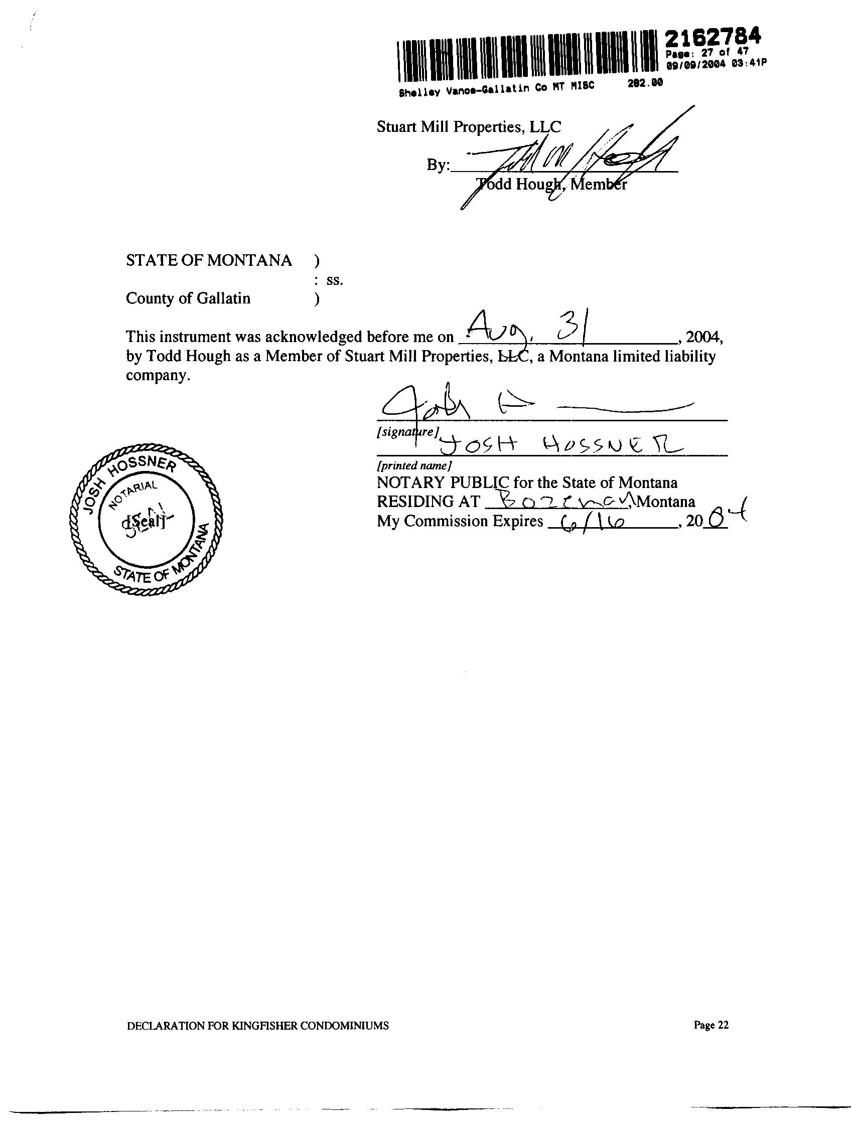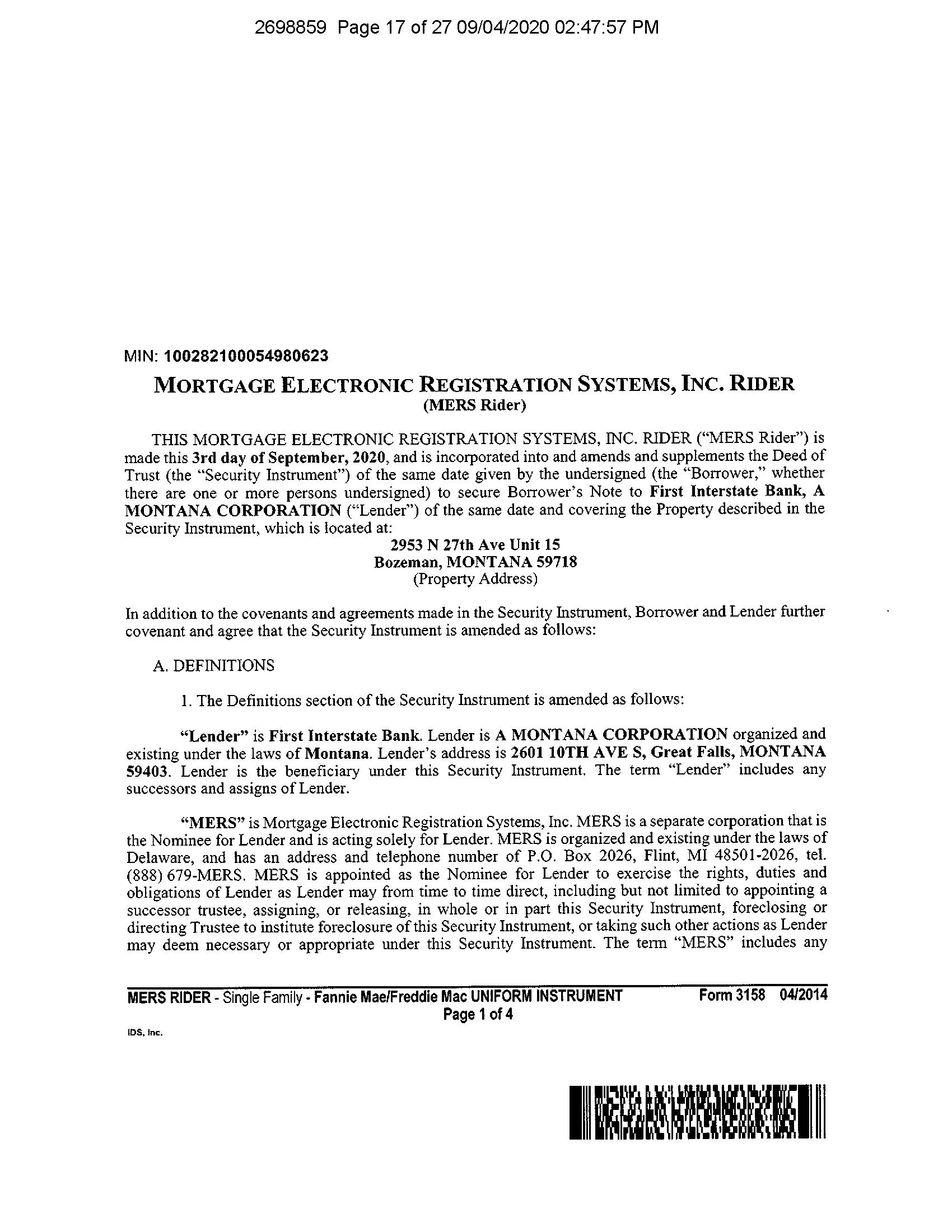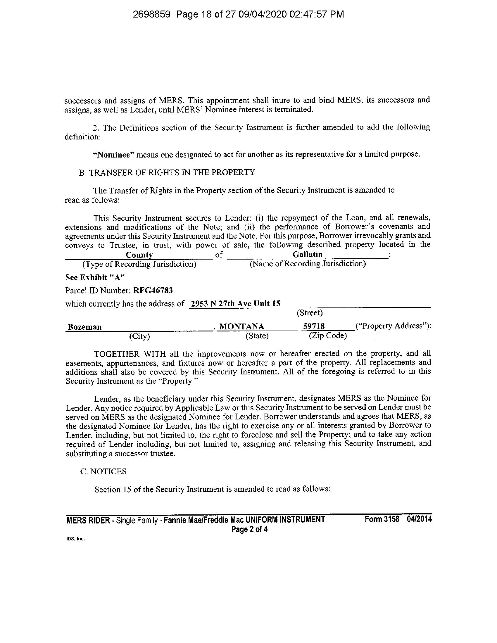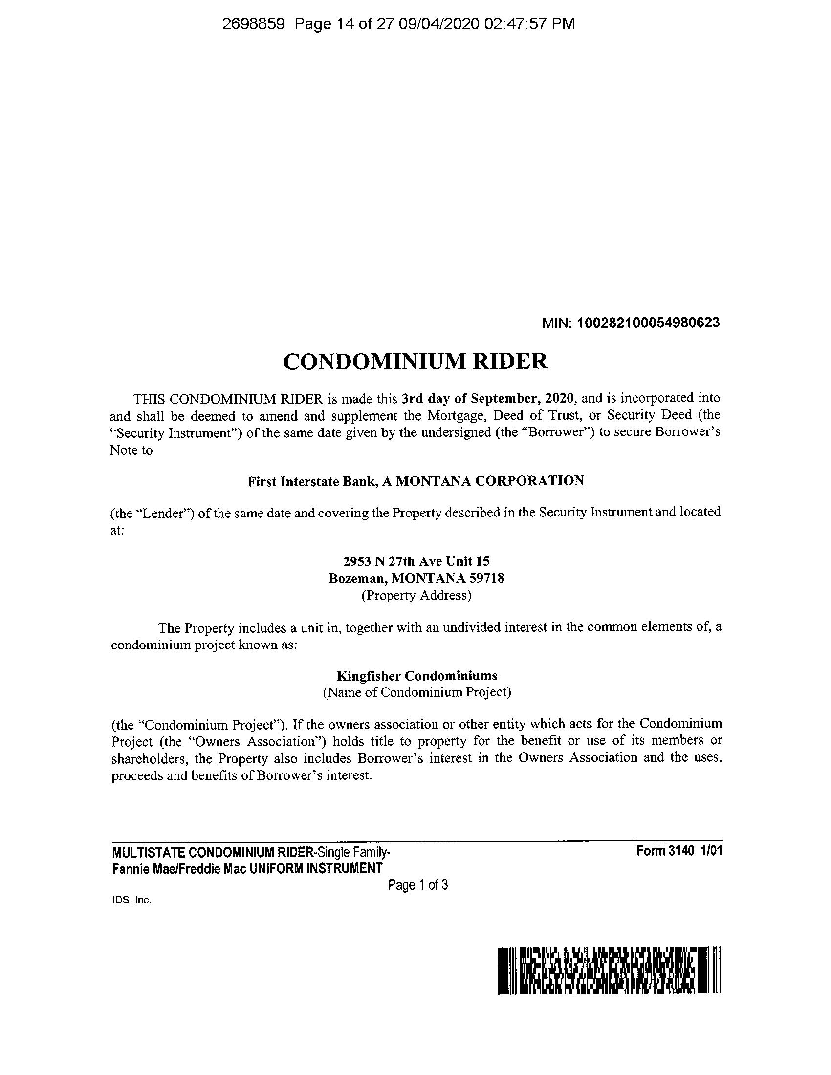 Legal Records: Geo Code: 06-0904-35-2-03-03-7015 Instru#: 2698858 Date: 2020-09-04 Property address: 2953 N 27TH AVE UNIT 15, BOZEMAN MT TRS: T01 S, R05 E, Sec. 35 Legal: KINGFISHER CONDO, S35, T01 S, R05 E, UNIT 15