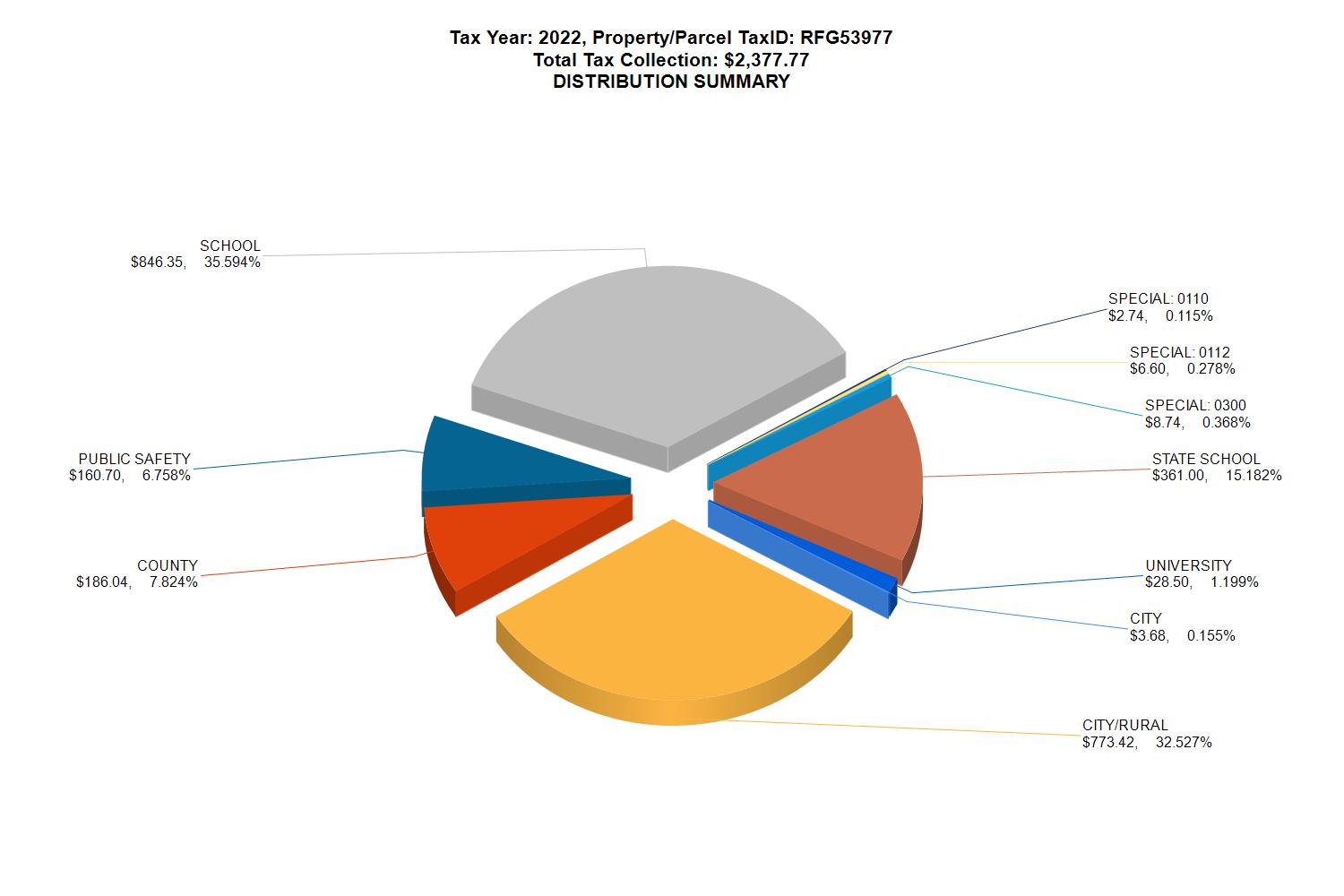 Shopping Cart: 0 items [$0 00] Tax Year: 2022 Property/Parcel TaxID: RFG53977 Status: Current Type: RE Owner: YONKIN DALE O & BOUNGYOB 2022 Tax Breakdown: Stat# Kind Description 1st Half 2nd Half 53977 CITY CITY TAXES $1.84 $1.84 53977 CITY/RURAL CITY/RURAL TAXES $386 71 $386 71 53977 COUNTY COUNTY TAXES $93 02 $93 02 53977 PUBLIC SAFETY PUBLIC SAFETY $80.35 $80.35 53977 SCHOOL LOCAL SCHOOL TAXES $423 18 $423 17 53977 SPECIAL: 0110 GLTN CONSV DIST MILLS $1 37 $1 37 53977 SPECIAL: 0112 GLTN CO WTR QUALITY (FEE) $3 30 $3 30 53977 SPECIAL: 0300 OPEN SPACE BOND MILLS $4 37 $4 37 53977 STATE SCHOOL STATE SCHOOL TAXES $180 50 $180 50 53977 UNIVERSITY UNIVERSITY/COLLEGE $14 25 $14 25 1st Half Total: $1,188 89 2nd Half Total: $1,188 88 Total Tax: $2,377 77