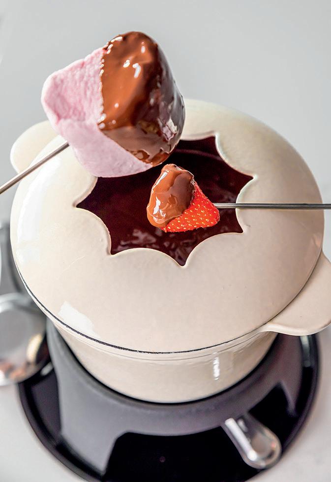 Chocolate Fondue: A sweet ending to any meal. Melted chocolate (dark, milk, or white) is served with fruits, marshmallows, cake bites, and cookies. You can add liqueurs like Grand Marnier or Amaretto for a grown-up twist.