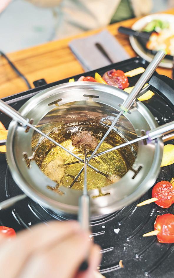 bread during the colder months. Today, it’s evolved into a versatile and festive meal that can be adapted to suit any taste or occasion. The beauty of fondue lies in its simplicity: a communal pot of melted goodness, be it cheese, chocolate, or oil paired with a variety of dippable delights. It’s warm, indulgent, and encourages conversation and laughter.
