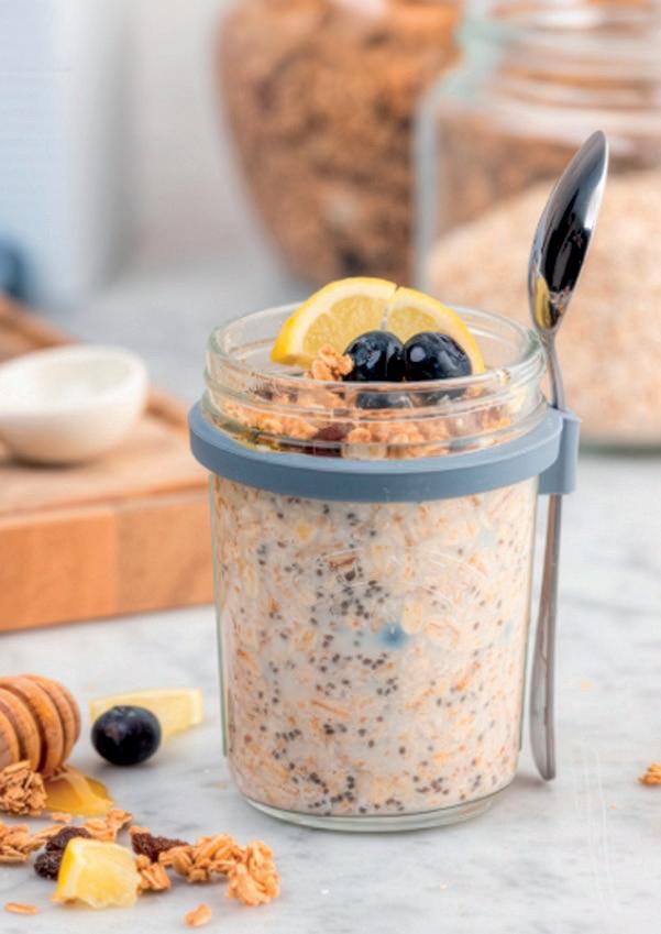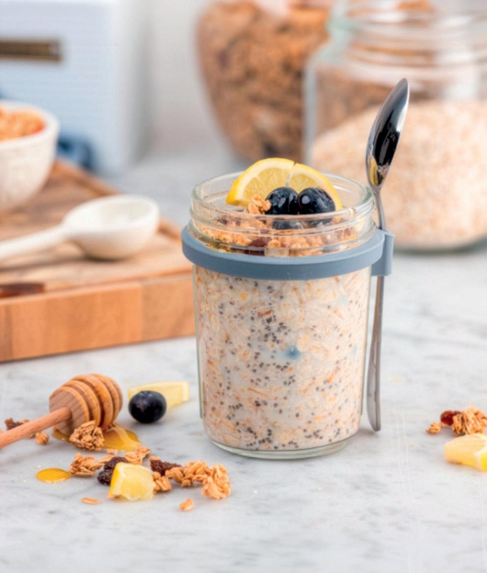 • Combine the rolled oats, chia seeds, milk, lemon zest, lemon juice and a couple of blueberries in a Kilner Breakfast Jar.