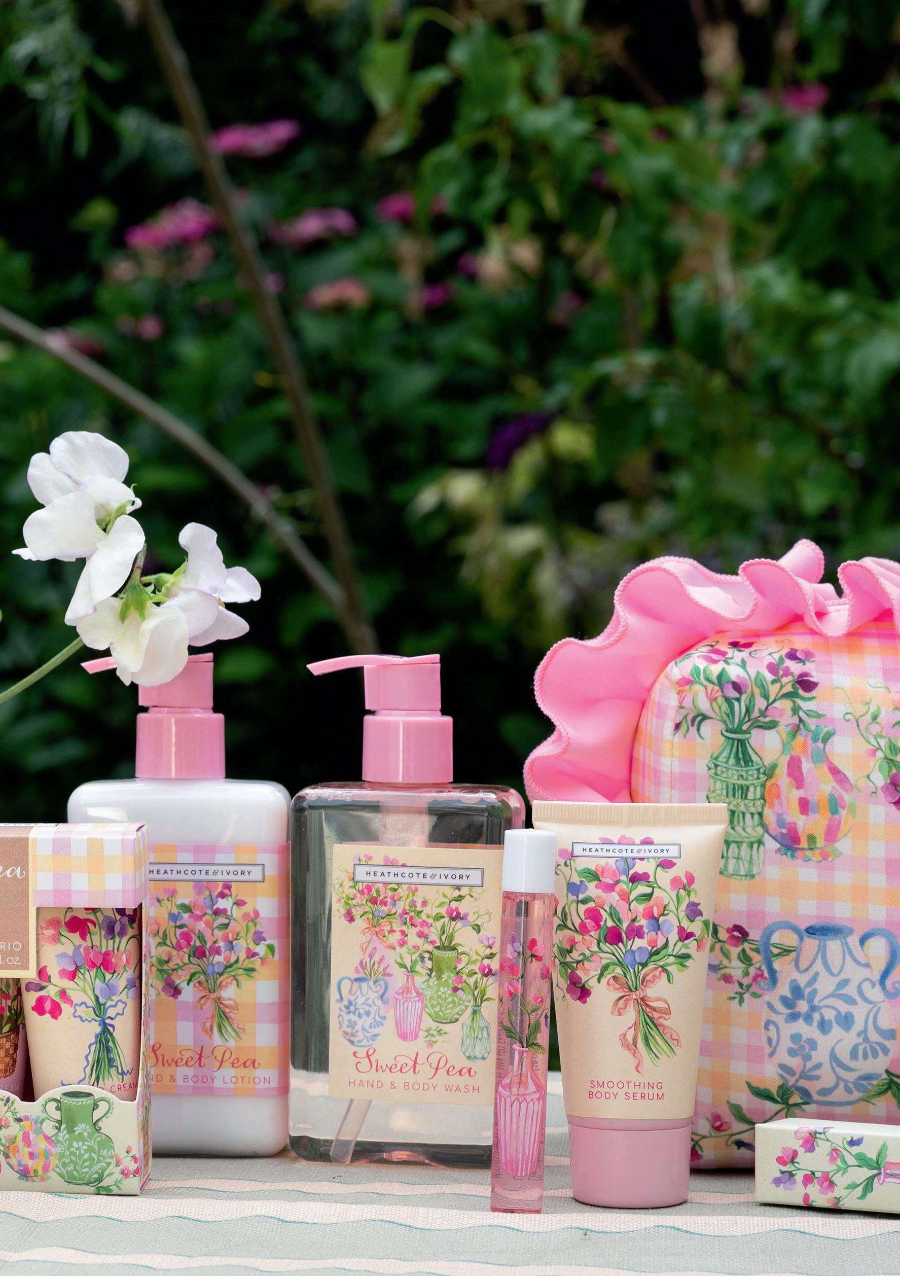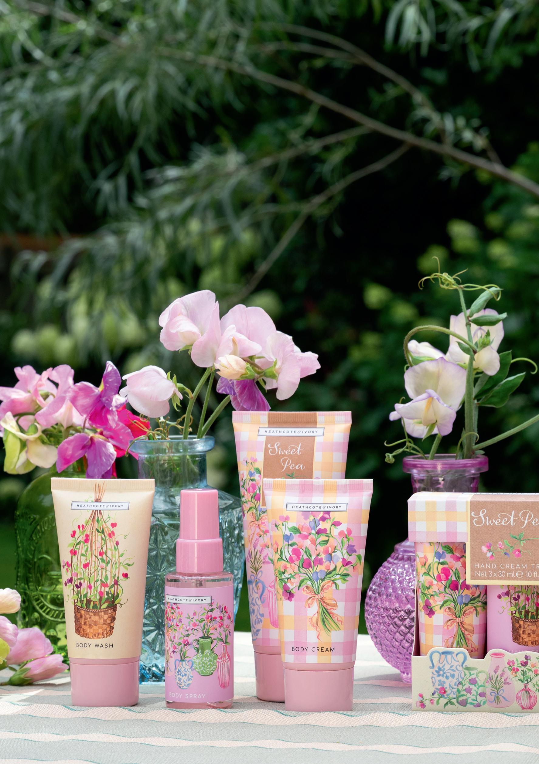 Inspired by Sweet Peas climbing up teepees, featuring hand-painted tabletop vases, pretty bows, and iconic skincare formulations. Enriched with evening primrose oil, vitamin E, shea butter, Sweet Pea and patchouli extracts.