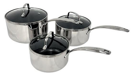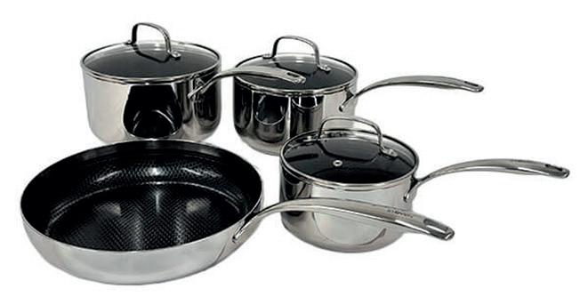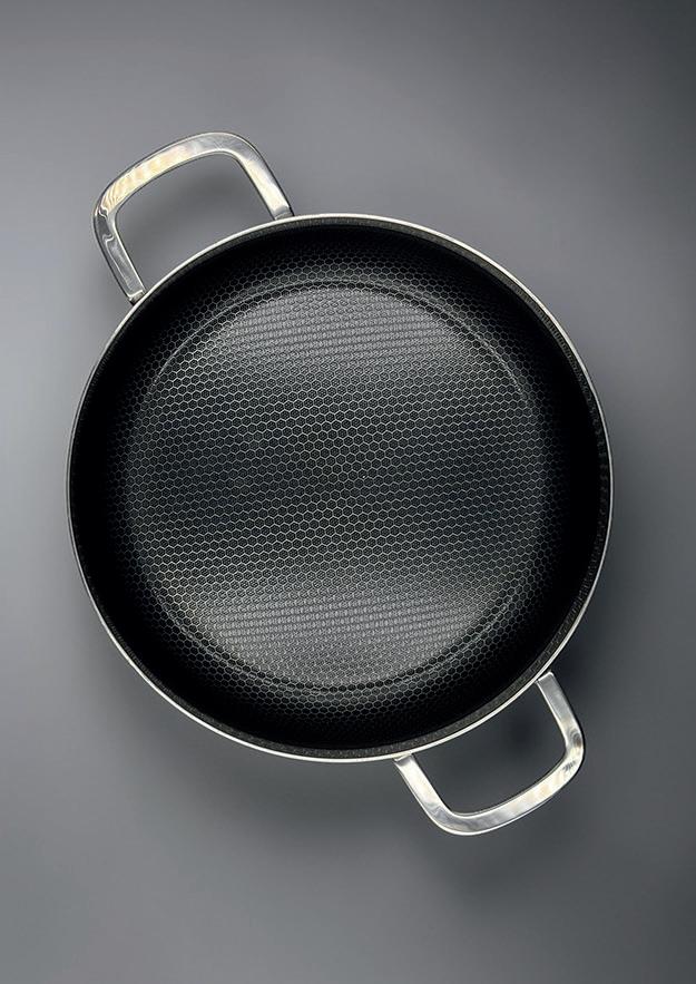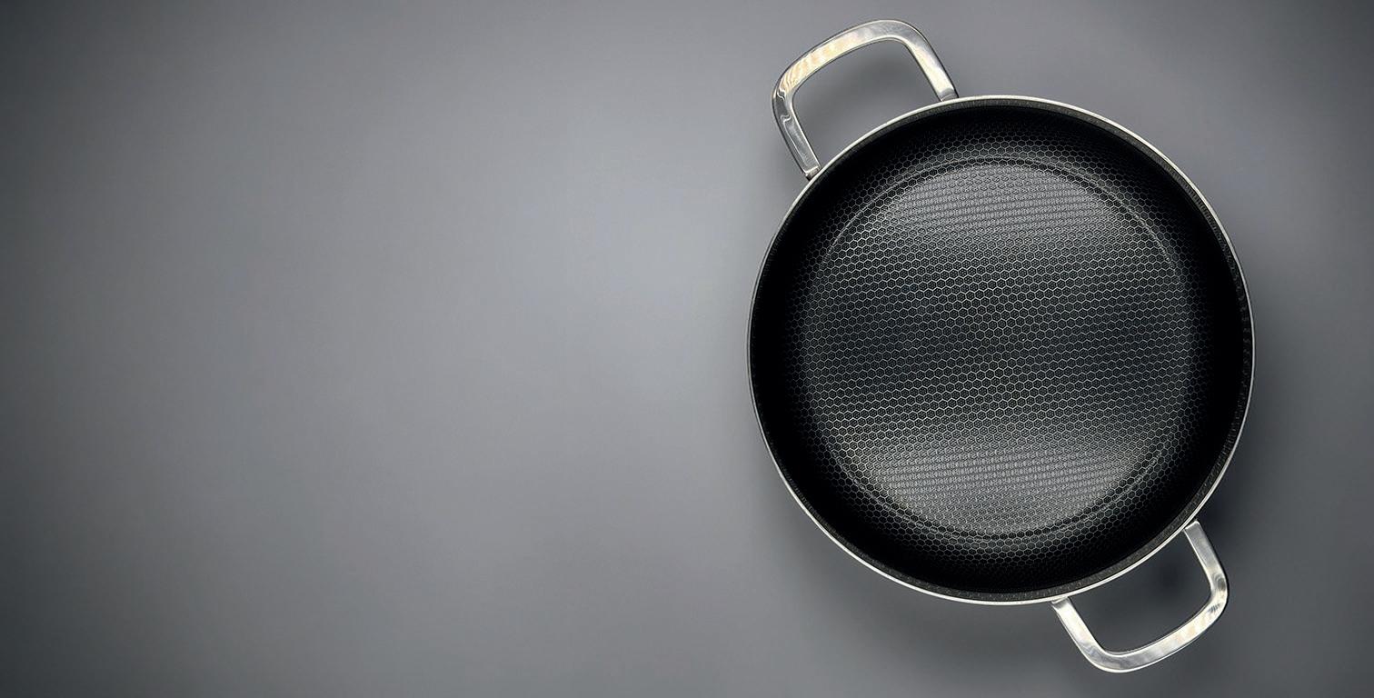 Stoven Hextra pans feature an innovative Hybrid HEX surface, a raised stainless-steel pattern that: