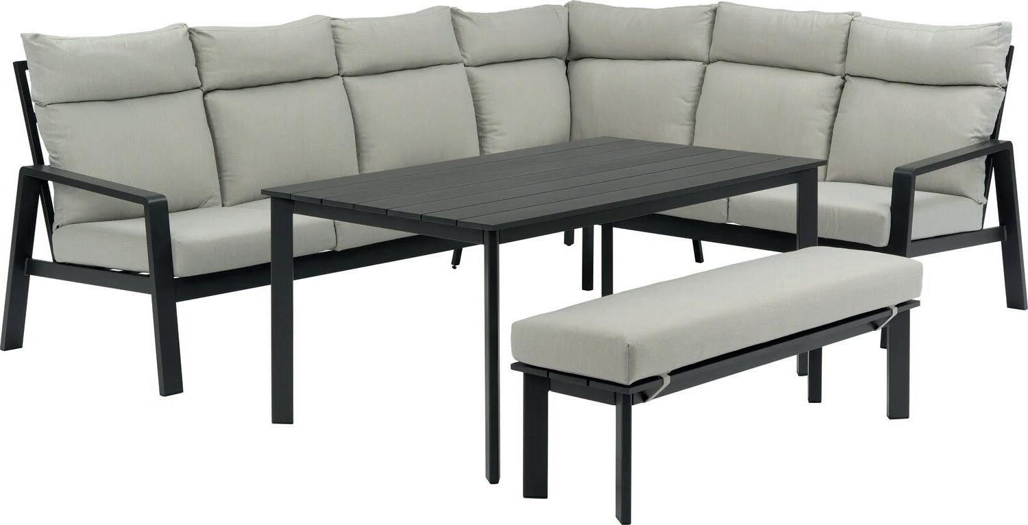 Set is 3-delig en bestaat uit loungebank hoek, eettafel/dinnertafel en tuinbank. Hoekopstelling is links- of rechtsom verkrijgbaar. Gemaakt van hoogwaardig aluminium. Kleur antraciet.