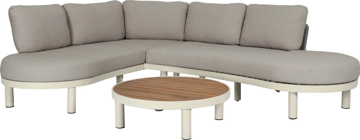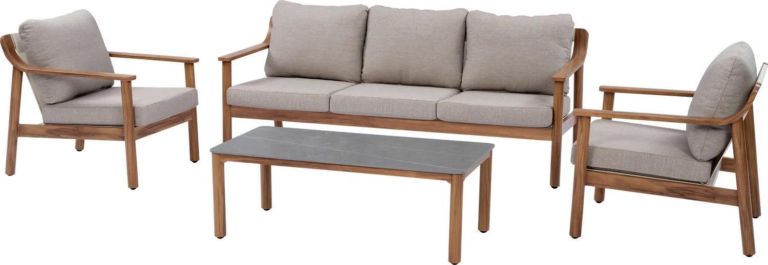 Nora is 5-persoons loungeset en bestaat uit een 3-zits loungebank, twee loungestoelen en een loungetafel met een tafelblad van sintered stone. Kleur naturel.