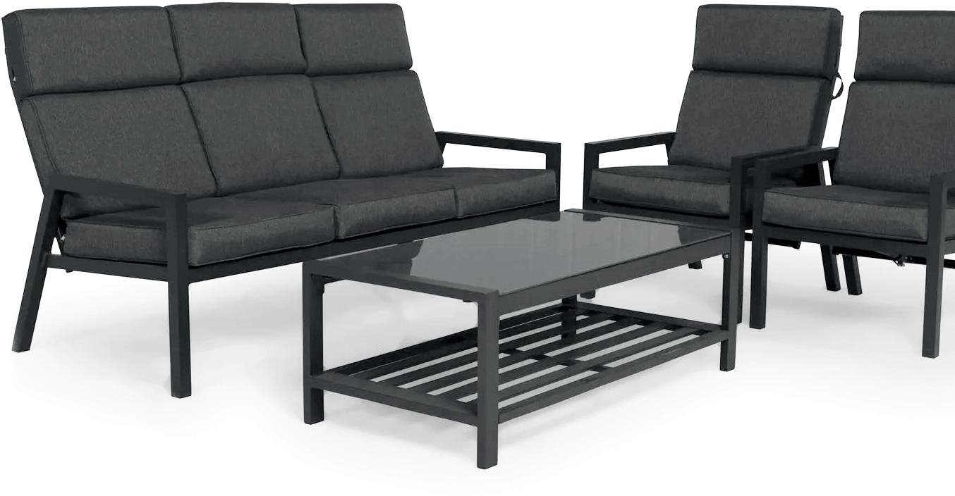 Deze loungeset bestaat uit een 3-zits loungebank, twee loungestoelen met verstelbare rugleuning en een loungetafel met glasplaat. Gemaakt van hoogwaardig aluminium.