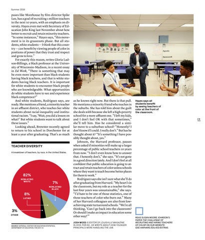 as he knows right now. But there is that pull. He mentions a minority friend who teaches in the suburbs. She has told him about the guilt she deals with because she left a high-poverty school for a more affluent one. “I left my kids, and I don’t feel OK with that sometimes,” she’ll tell him. Has he considered a similar move to a suburban school? “Honestly? I don’t know if I could. I really don’t.” But has he thought about it? “It’s something I have possibly thought about, yes.” Johnson, the Harvard professor, pauses when asked if minorities will make up a larger percentage of public school teachers 10 years from now. “I don’t even know how to answer that. I honestly don’t,” she says. “It’s not gone in a good direction lately. And I don’t feel at all confident that public education is going to attract and retain teachers of color unless schools where they want to teach become better places for them to work.” Rodriguez says she isn’t sure what she’ll do after graduating from Harvard. “My heart’s in the classroom, but my role as a teacher for the last four years was unsustainable,” she says. “I’d hate to be one of those statistics, one of those teachers of color who burn out.” Many of her Harvard colleagues are also from lowachieving state turnaround schools. “We’re all thinking, ‘Can I go back into the classroom? Or should I make an impact in education some other way?’” JOSH MOSS IS EDITOR OF LOUISVILLE MAGAZINE. IN 2010, FOR ED., HE WROTE ABOUT HOW YOUNGER PRINCIPALS WERE HANDLING THE JOB.