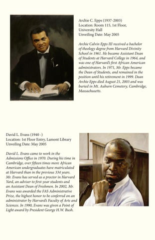 Archie C. Epps (1937-2003) Location: Room 115, 1st Floor, University Hall Unveiling Date: May 2005 Archie Calvin Epps III received a bachelor of theology degree from Harvard Divinity School in 1961. He became Assistant Dean of Students at Harvard College in 1964, and was one of Harvard’s first African American administrators. In 1971, Mr. Epps became the Dean of Students, and remained in the position until his retirement in 1999. Dean Archie Epps died August 21, 2003 and was buried in Mt. Auburn Cemetery, Cambridge, Massachusetts.