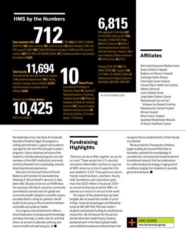 Fundraising Highlights “Alone we can do so little; together we can do so much.” These words from U.S. educator and author Helen Keller continue to ring true at HMS, where our circle of supporters this year swelled to 4,233. These generous alumni, friends, board members, volunteers, faculty, staff, foundations and corporations gave more than $315 million in fiscal year 2019— an annual fundraising record for HMS—to advance our mission in service to the world. The impact of this philanthropy has been tangible. We increased the number of scholarships, financial aid packages and fellowship funds for MD, MD-PhD, PhD and master’s students and boosted funding for postdoctoral researchers. We introduced the Sexual and Gender Minorities Health Equity Initiative, pioneered work in the field of global health and established endowed professorships that