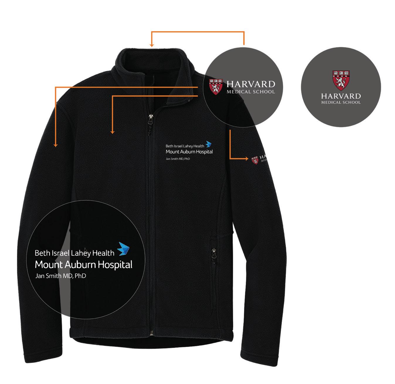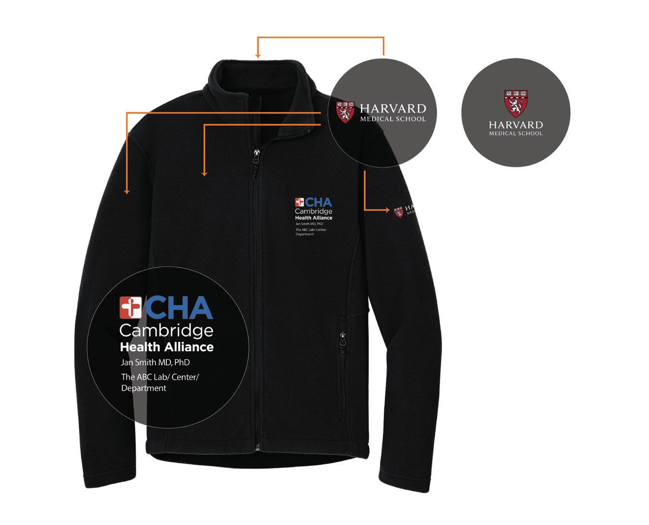 For jackets and fleeces bearing the affiliate institution’s icon and wordmark, the HMS affiliate or teaching hospital tag logo must appear on the opposite chest, shoulder, or back of the neck, and it must be sized equal to or smaller than the affiliate institution’s logo (not including the descriptive text for the lab/center/department). No additional information or logos may be added to these garments.