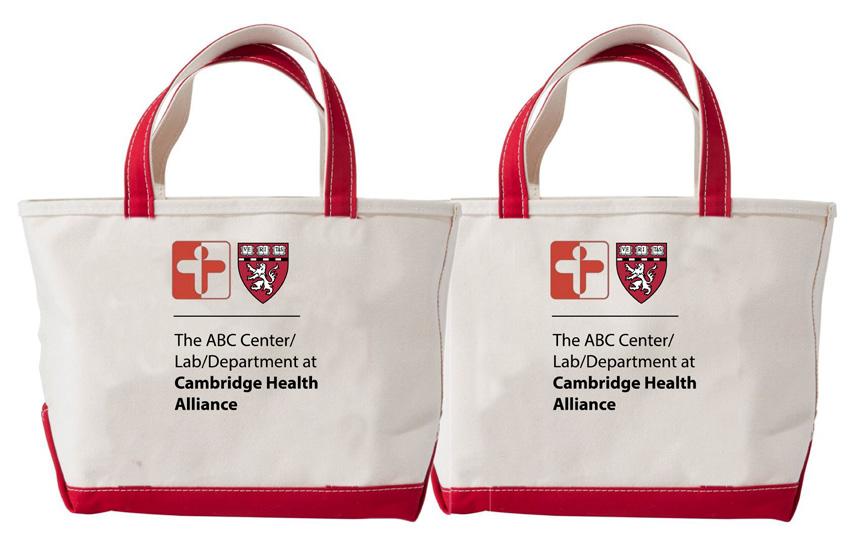 Two arrangements are available for labs/centers/departments ordering most swag items, such as tote bags. When full logos are used, there needs to be enough space to separate the affiliate institution’s logo from the HMS affiliate or teaching hospital tag logo, and descriptive text should identify the lab/center/department under the affiliate logo. When the dual-icon arrangement is preferred or there is not sufficient space to separate full logos, the affiliate institution’s icon and HMS shield may be placed side-by-side provided that there is descriptive text for the lab/center/ department. Please reference page 12 for shield and text size guidance. No additional information or logos may be added to these items.