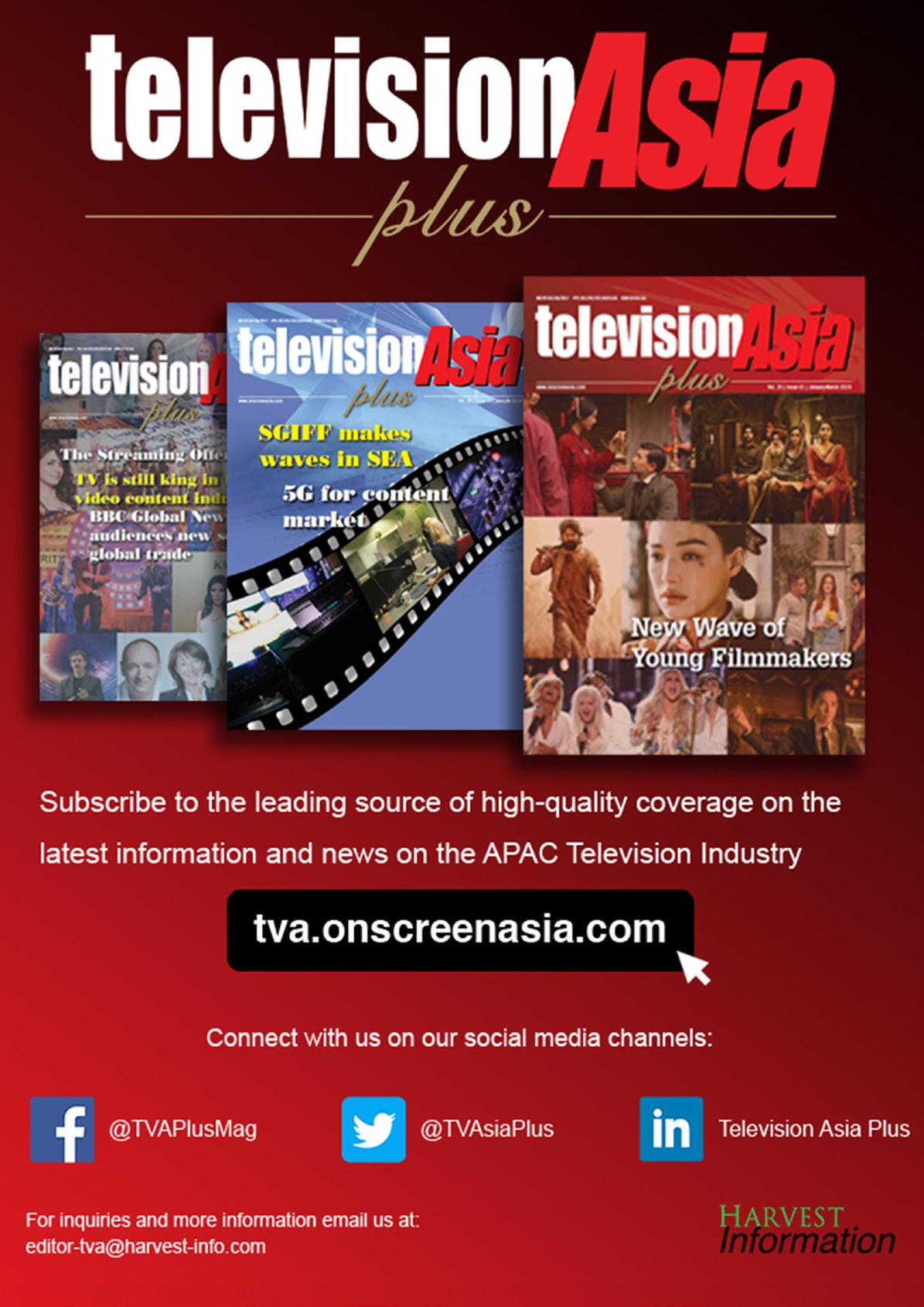 In the market for over two decades, Television Asia Plus has been proven to be a reliable and reputable television content journal We reach 15,000 senior content professionals across Asia Pacifi c through our web, social media, e-newsletters and print products https://tva.onscreenasia.com