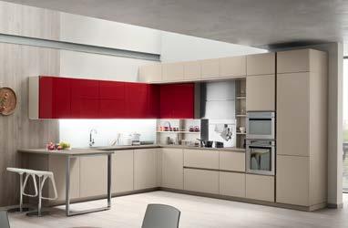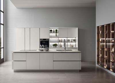 Kuhinja TWIST s aparatima*: napa + pećnica + ploča (staklokeramika) + sudoper, širina 240cm, cement siva mat, bijela visoki sjaj i taupe visoki sjaj.