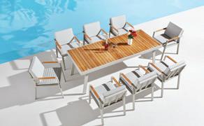 9 komada, stol 90x220cm, 8x stolica s rukonaslonom i jastucima, aluminij/tikovina