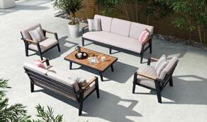 2-sjed 150x82cm s jastucima, 2x fotelja 77x82cm s jastucima, stolić 65x120cm, akacija
