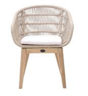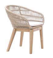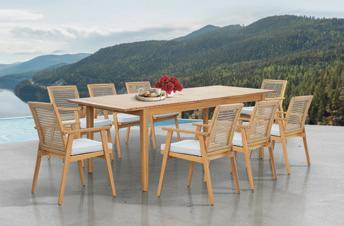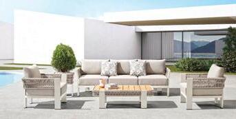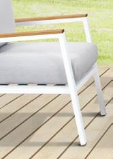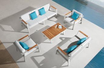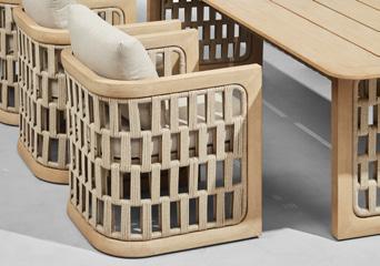 3-sjed s jastucima 217x77cm, 2x fotelja s jastucima 81x77cm, stolić 70x120cm, aluminij/tikovina/uže. Dostupne dvije kombinacije boja.
