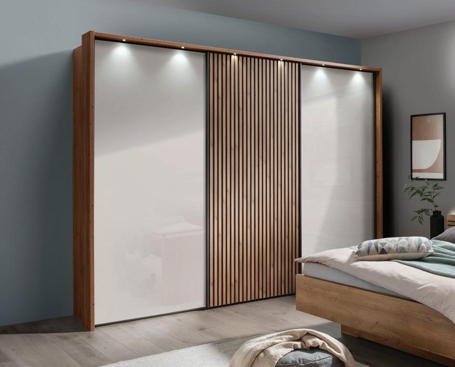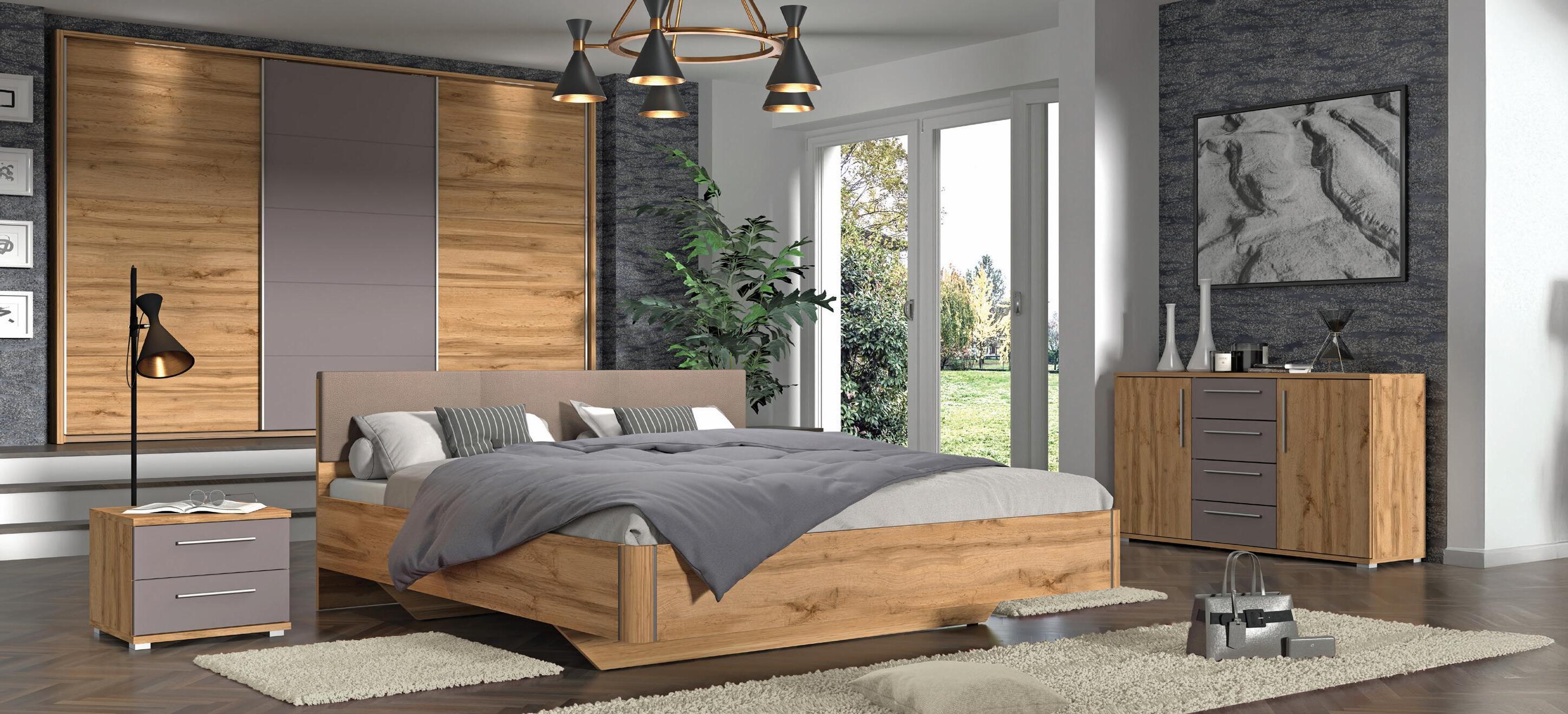 Celotna spalnica MONTANA posteljni okvir 160x200cm, 2x nočna omarica 45x40x47cm, garderobna omara 270x225x60cm, w.hrast/truffle. Okrasni okvir na omari in komoda za doplačilo.