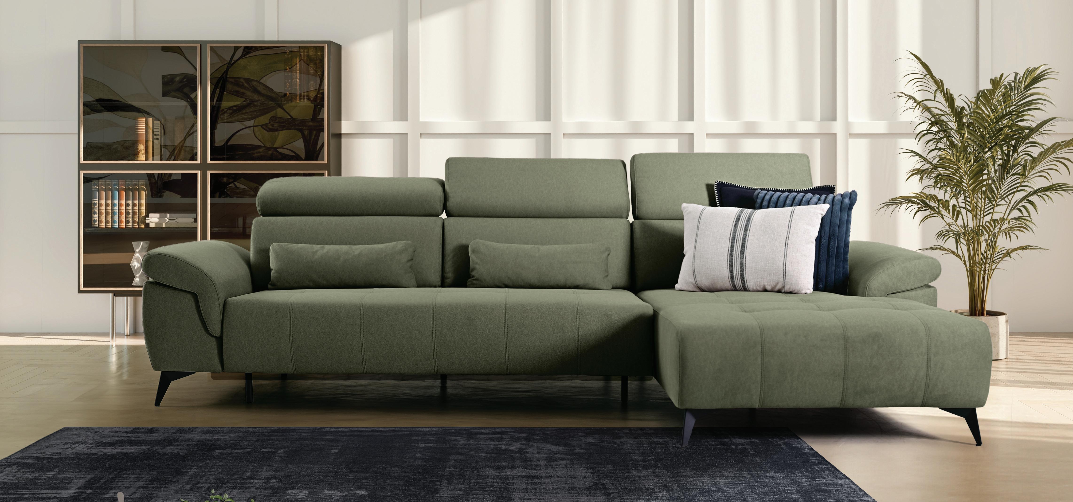 €2.690 Kotna sedežna TOGO S, vzmeteno 308x183cm, leva ali desna postavitev, električno pomično sedišče, 3x nastavljiv vzglavnik, material CASTEL različne barve