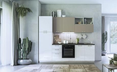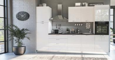 2.349 € Kuhinja INFINITY s aparatima: hladnjak + perilica + napa + pećnica + ploča (staklokeramika) + sudoper, širina 330cm visina 216cm, bijela sjaj, dostupna u tortora sjaj boji.