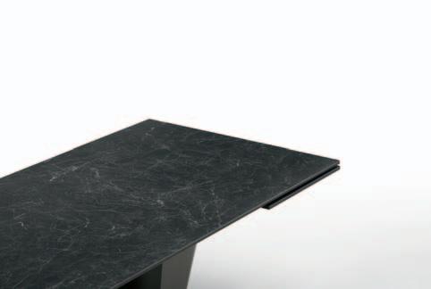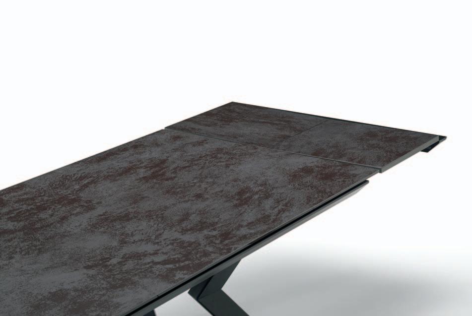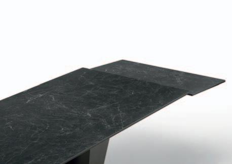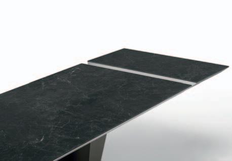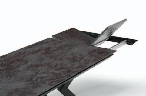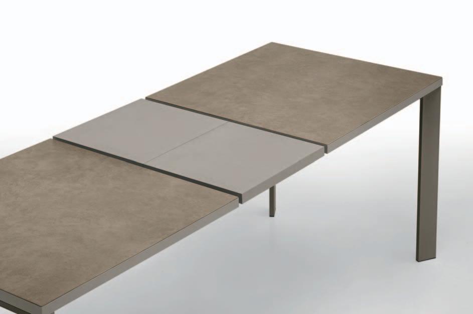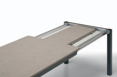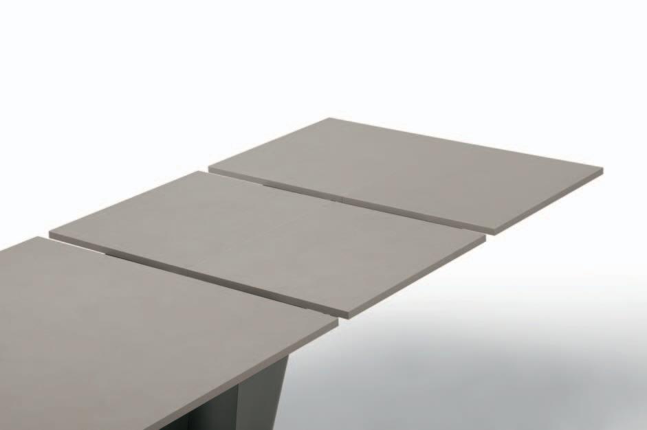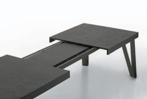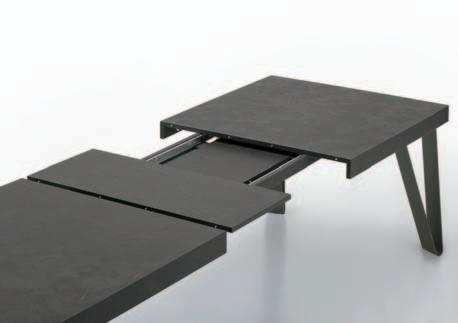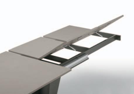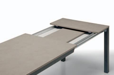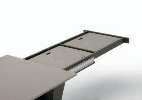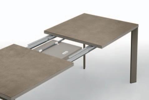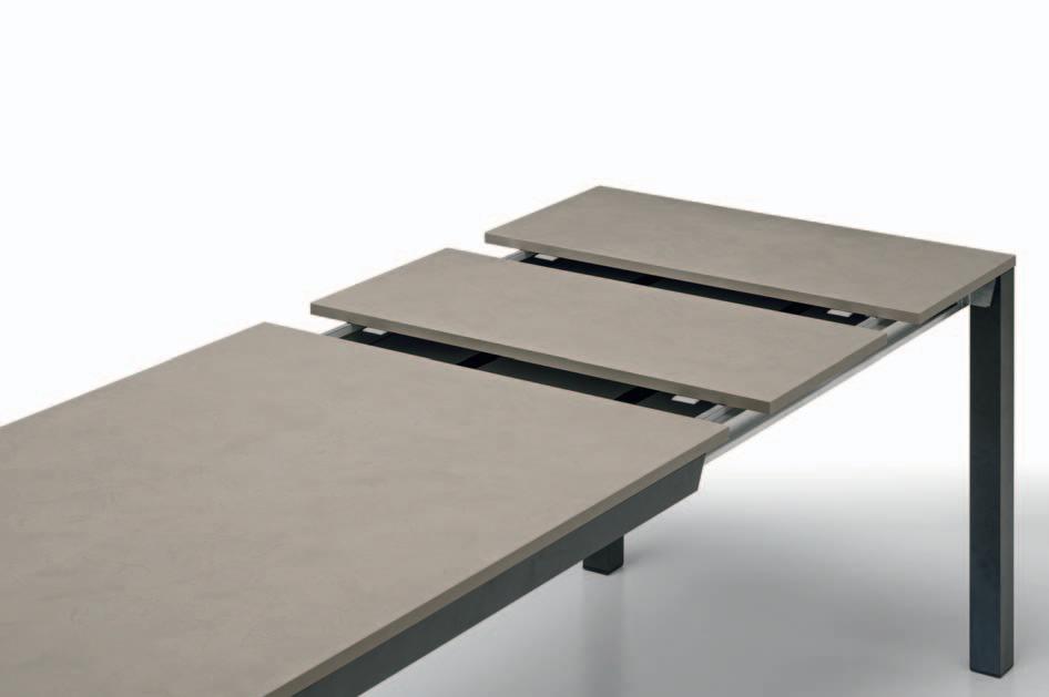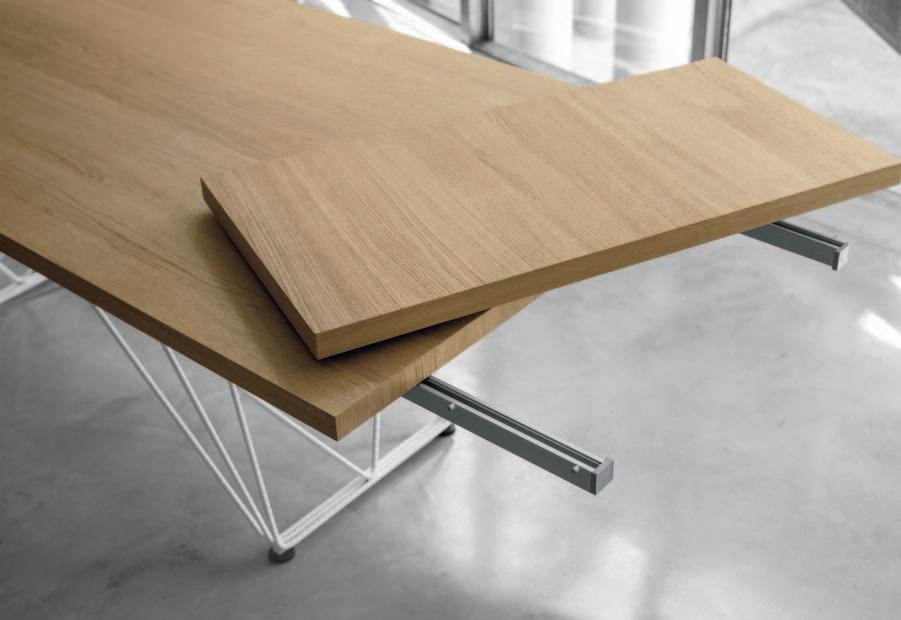 Due allunghe sono poste sotto il piano del tavolo, alle estremità di un binario scorrevole. Per allungare il tavolo è necessario far scorrere il binario verso l’esterno e alzarlo leggermente: in questo modo le allunghe escono e si posizionano a filo del piano principale. Un sistema molto pratico che permette di prolungare il tavolo senza rinunciare allo stile.