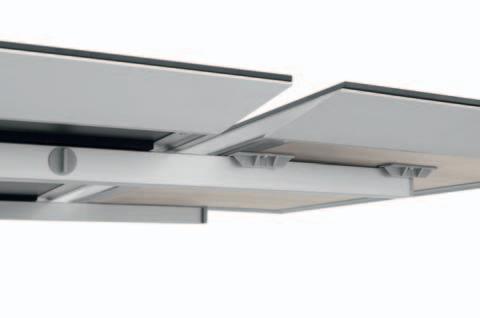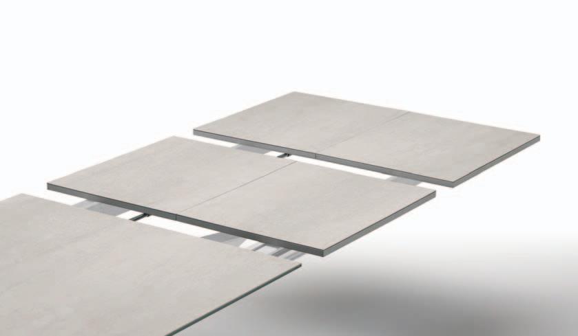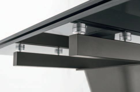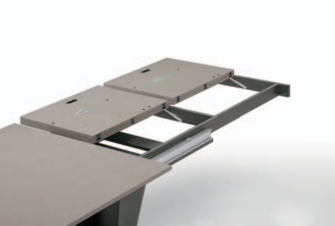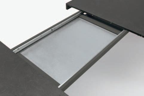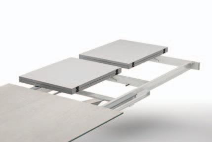 Due staffe per lato sono poste sotto il piano del tavolo e, all’occorrenza, escono con un movimento scorrevole. Le allunghe vengono appoggiate e agganciate sopra le guide ma, nel momento in cui non sono necessarie, vengono tolte per essere custodite in uno spazio a piacere, mentre le staffe rientrano. In pochi e semplici step, il tavolo aumenta di dimensioni e di stile.