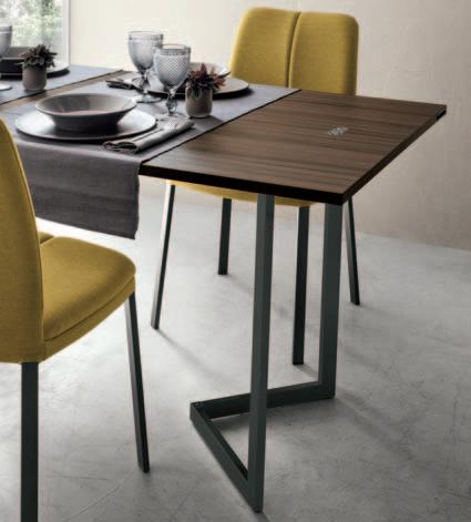 Il movimento ricorda quello dell’apertura di un cassetto: il piano del tavolo si apre lateralmente tramite un meccanismo scorrevole e al suo interno è riposta, agganciata e ripiegata “a libro” l’allunga. A questo punto, è sufficiente aprire anche l’allunga per ottenere un tavolo con più posti a sedere per i propri ospiti.