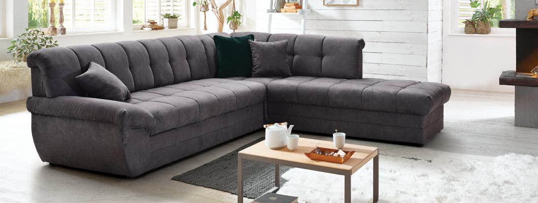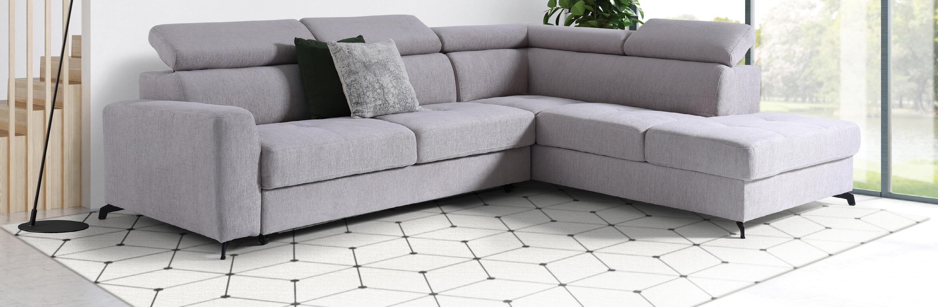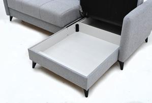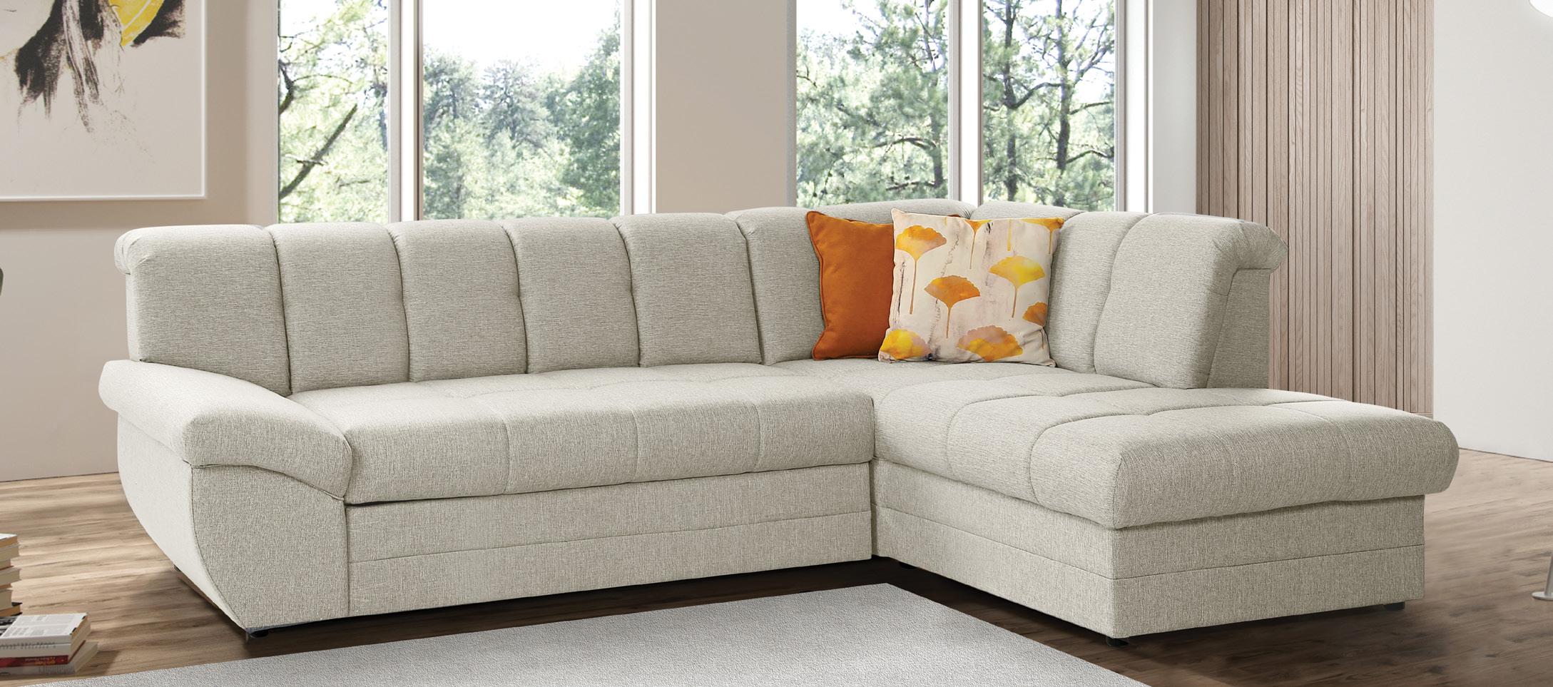 €890 €1.390 Kotna sedežna garnitura BOMBAY L, vzmeteno 208x325cm, leva ali desna postavitev, ležišče 160x290cm, velik predal, blago siva in bež