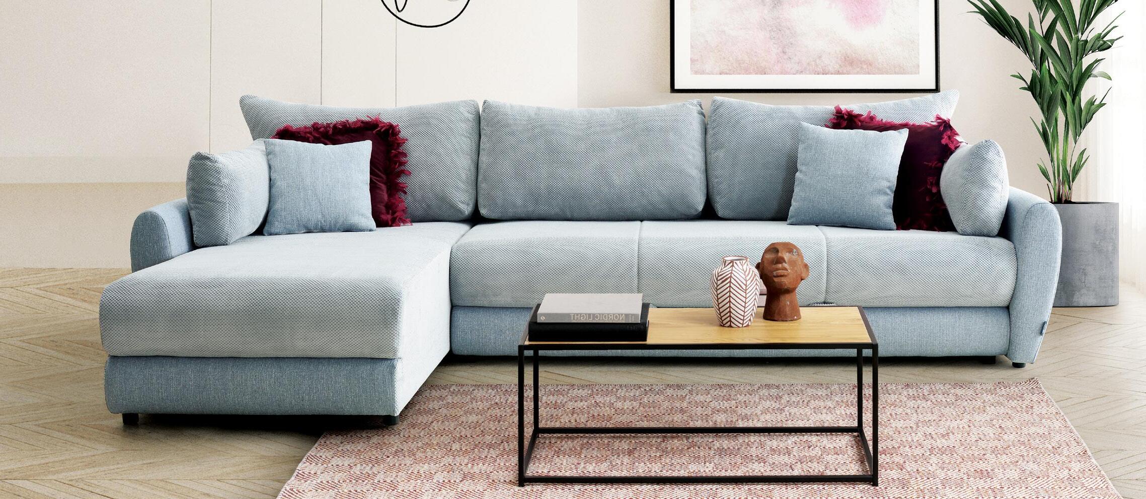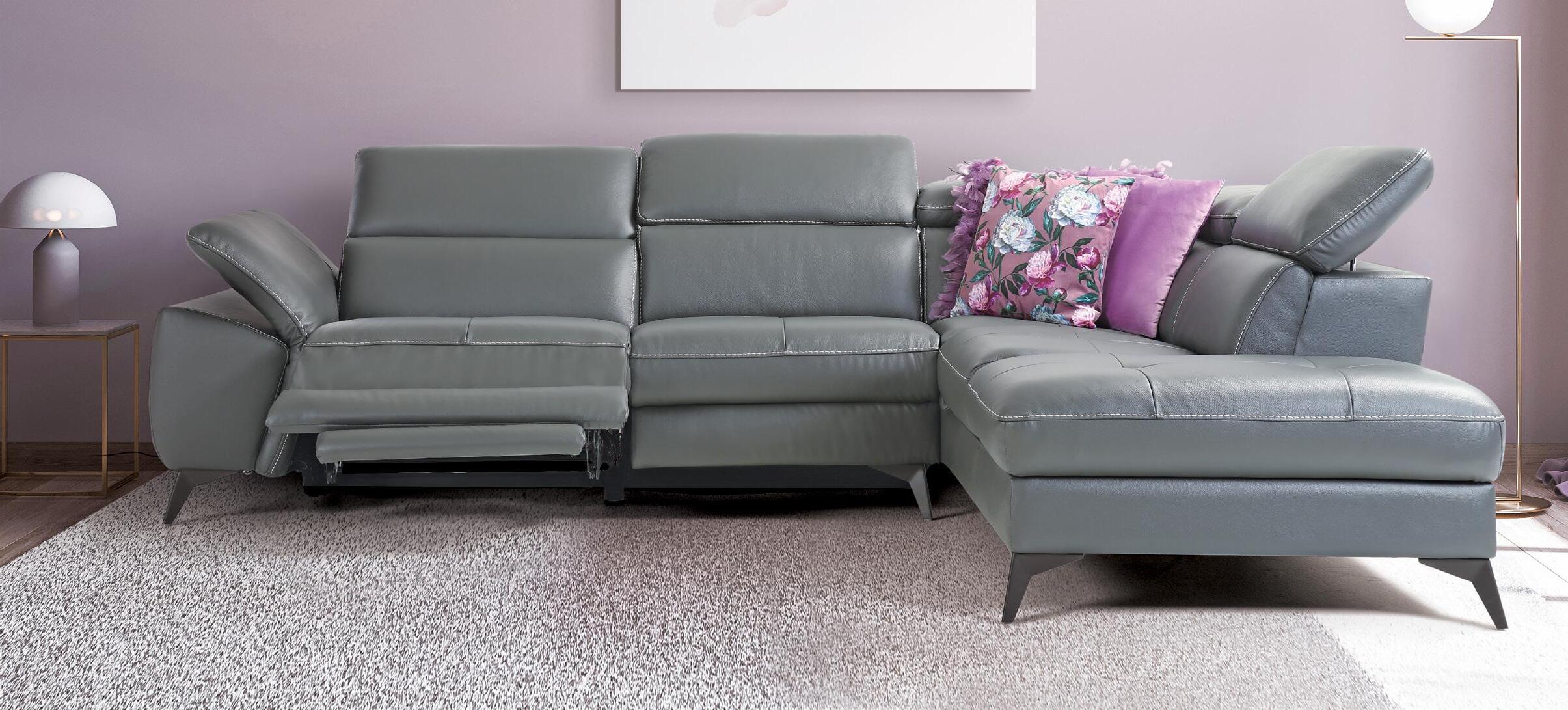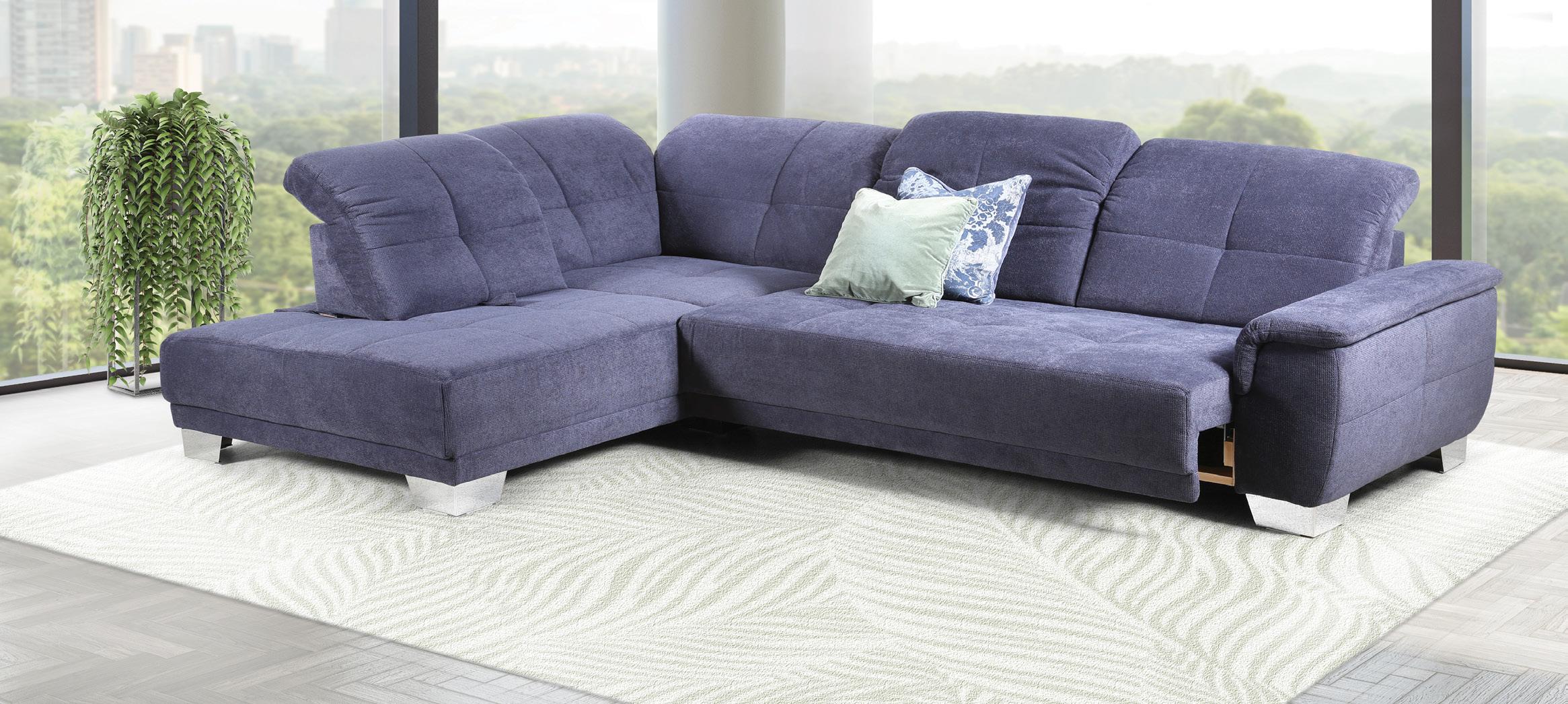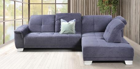 €990 €1.290 Kotna sedežna garnitura RELAX XL, 200x325x235cm, leva ali desna postavitev, ležišče, blago COSMIC 106 siva in 111 tem. modra.