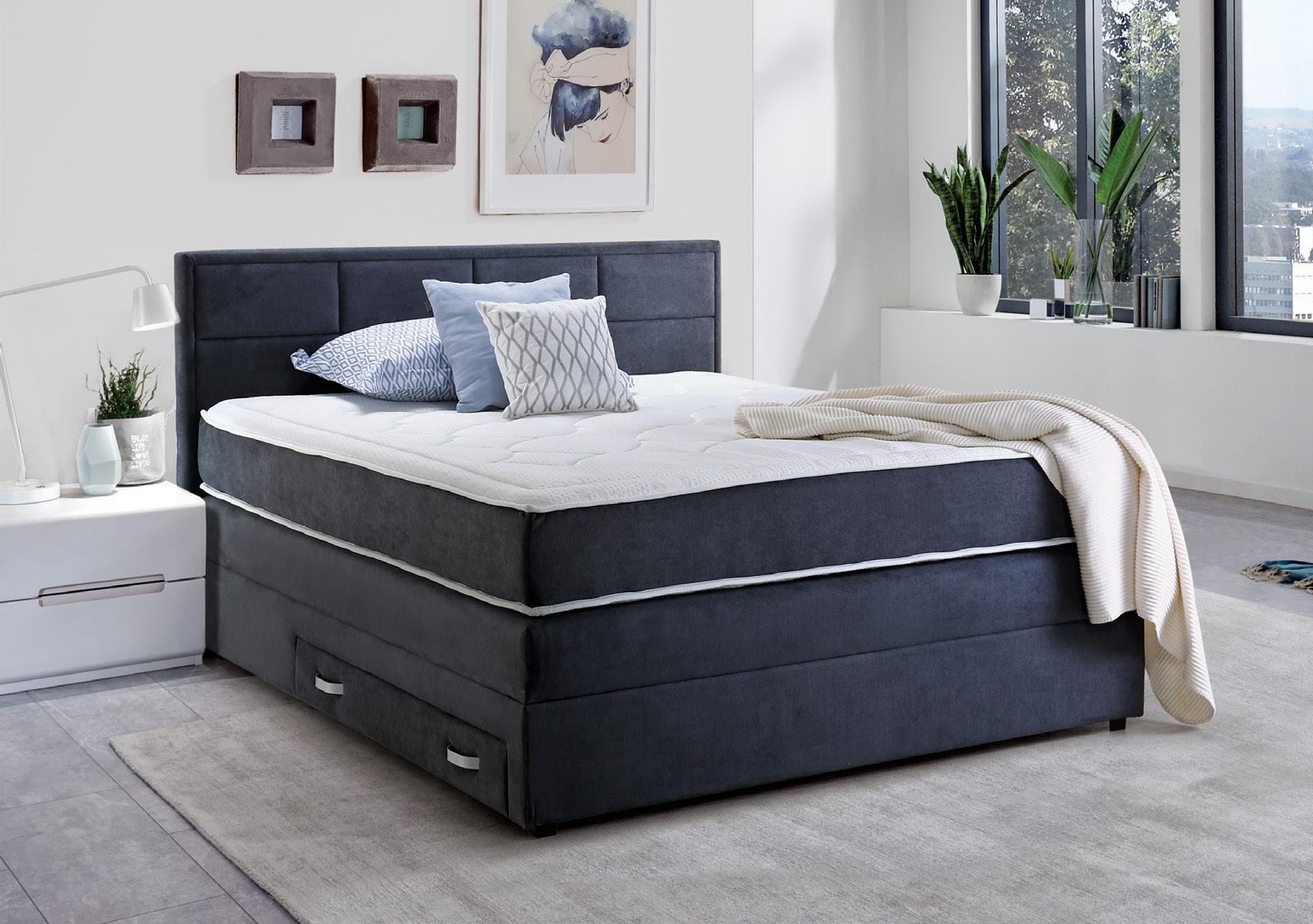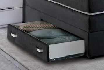 €849 Boxspring postelja PRINCE, 160x200cm celotna postelja z vzmetnico, BONEL vzmetenje, 2x predal, blago temno siva.
