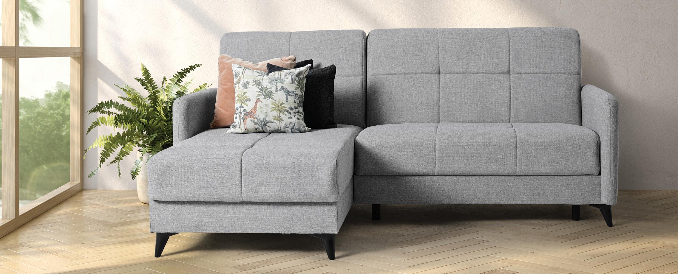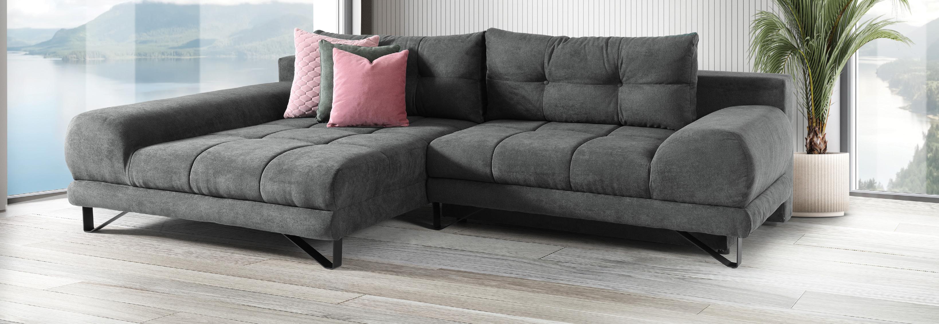 €739 €899 Kotna sedežna garnitura SANTI, 130x230cm, ležišče 125x210 cm, univerzalna postavitev, ležišče, predal, blago siva in temno siva