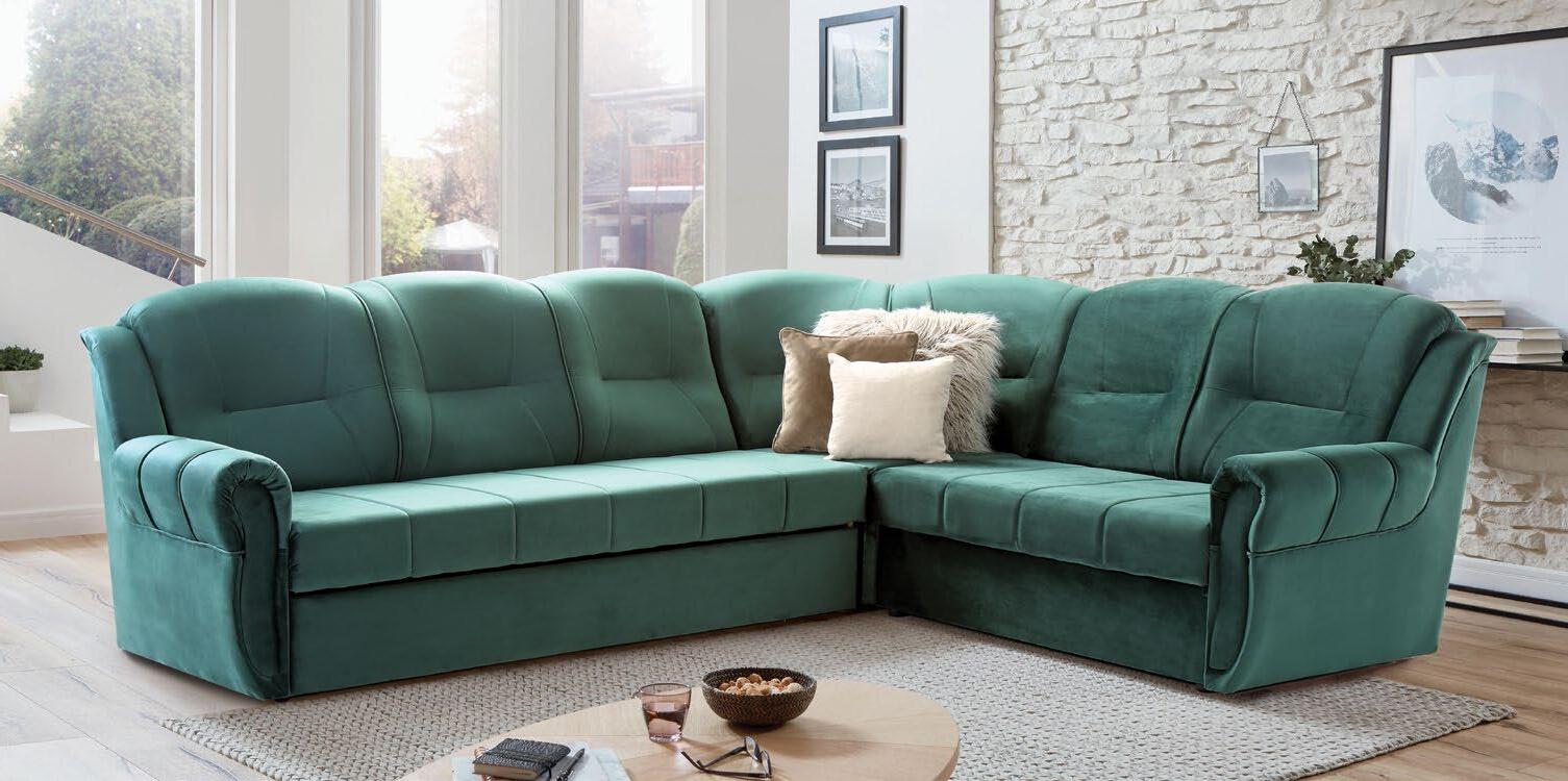€1.690 Kotna sedežna garnitura GOLF, vzmeteno, 274x198cm, leva ali desna postavitev, ležišče 136x226cm, predal, blago MEGAN svetlo siva ali zelena