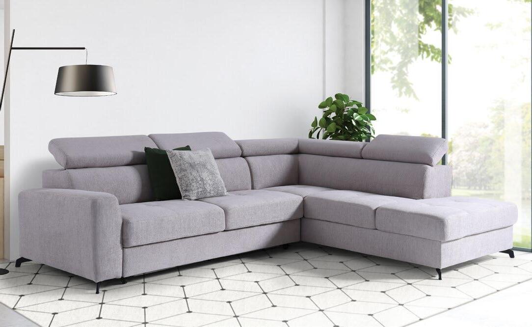 Kotna sedežna garnitura CITY, vzmeteno 282x218cm, leva ali desna postavitev, ležišče 125x210 cm, predal, 3x nastavljiv vzglavnik, kovinske noge, blago CARTER 9573 svetlo siva. Odprodaja zaloge!